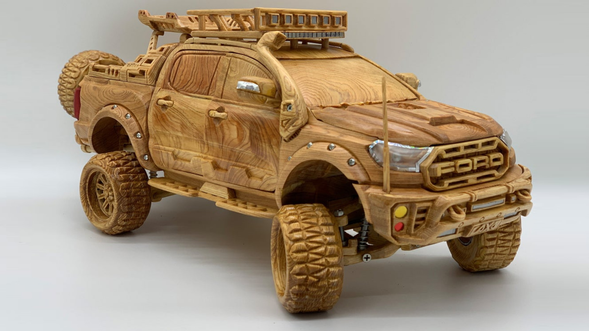 A far cry from the wooden spear whittling most of us are used to, YouTuber WoodworkingArt does some of the most incredible carvings we’ve ever seen. Not only do his vehicular creations look the part, but they typically have functional suspension and are capable of rolling around on wooden wheels and tires. This week, he’s decided to make a custom off-road build of a Ford Ranger Raptor, after carving a normal Ranger Raptor about a month ago and a Chevy Silverado pickup truck before that. He seems to be a truck fan, then.