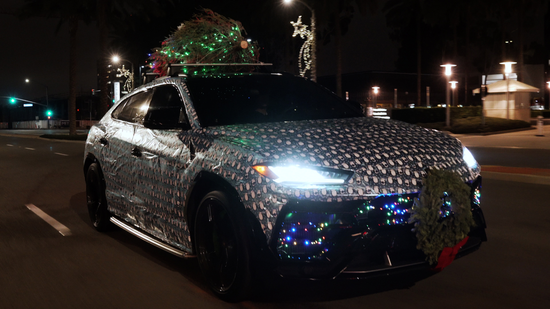 Or maybe you can, because that penguin wrapping paper that clings so loosely to the vehicle’s body panels is akin to wrapping a vacuum cleaner and giving it to your significant other on Christmas morning. And even if you can make out what it is (you can), it’s still Lamborghini’s super SUV that’s here to brighten your holidays just a little bit more.