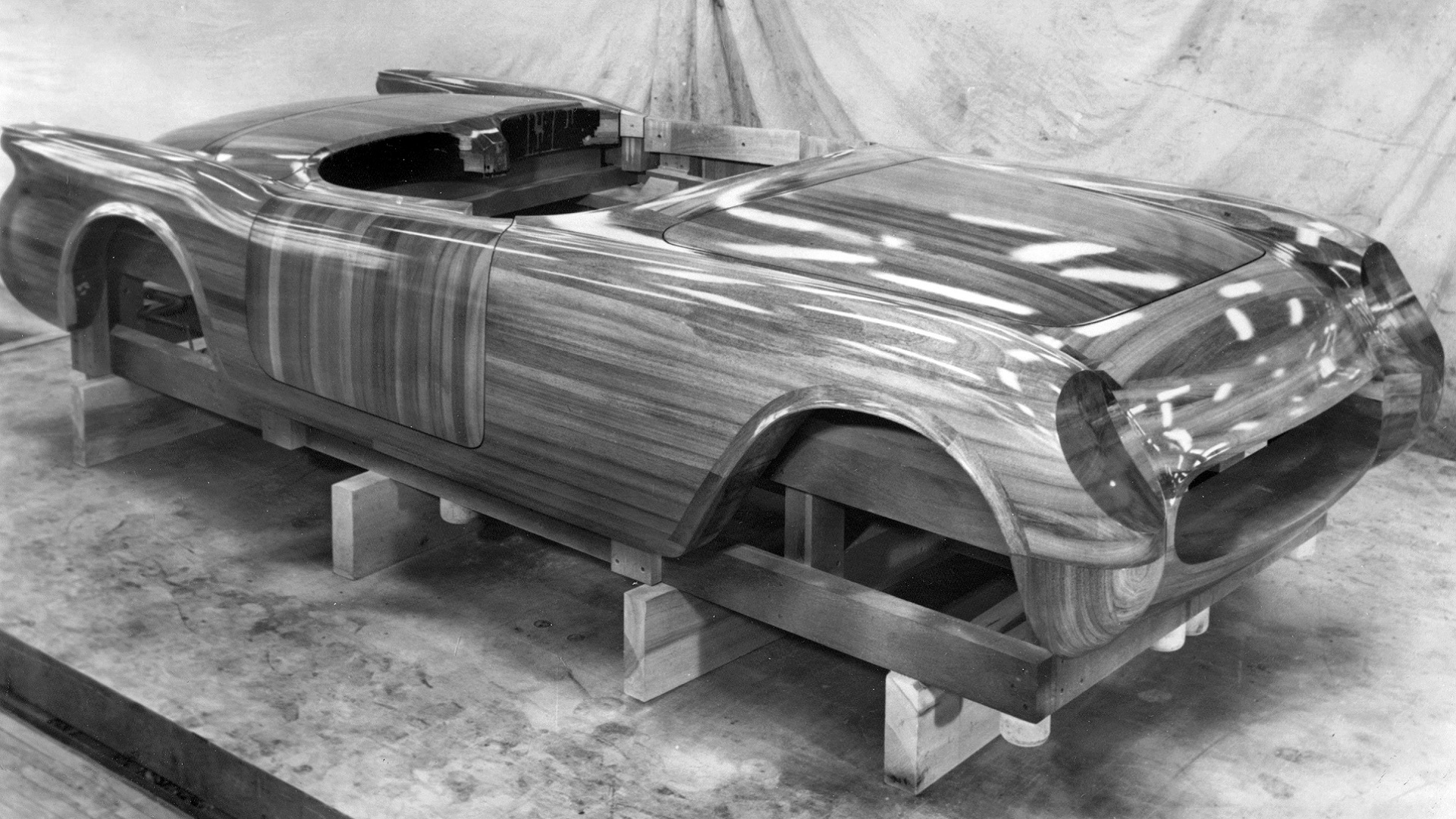 The wooden body bucks were used for the very first Corvette at the Motorama auto show and for some time after. They were carefully and meticulously hewn from mahogany, which is often chosen because it is less likely to warp, shrink, or swell than other woods. The fact that it’s a rich, beautiful color is a side benefit. During that period of time, sheet steel or aluminum were often hammered over body bucks to create panels for vehicles.