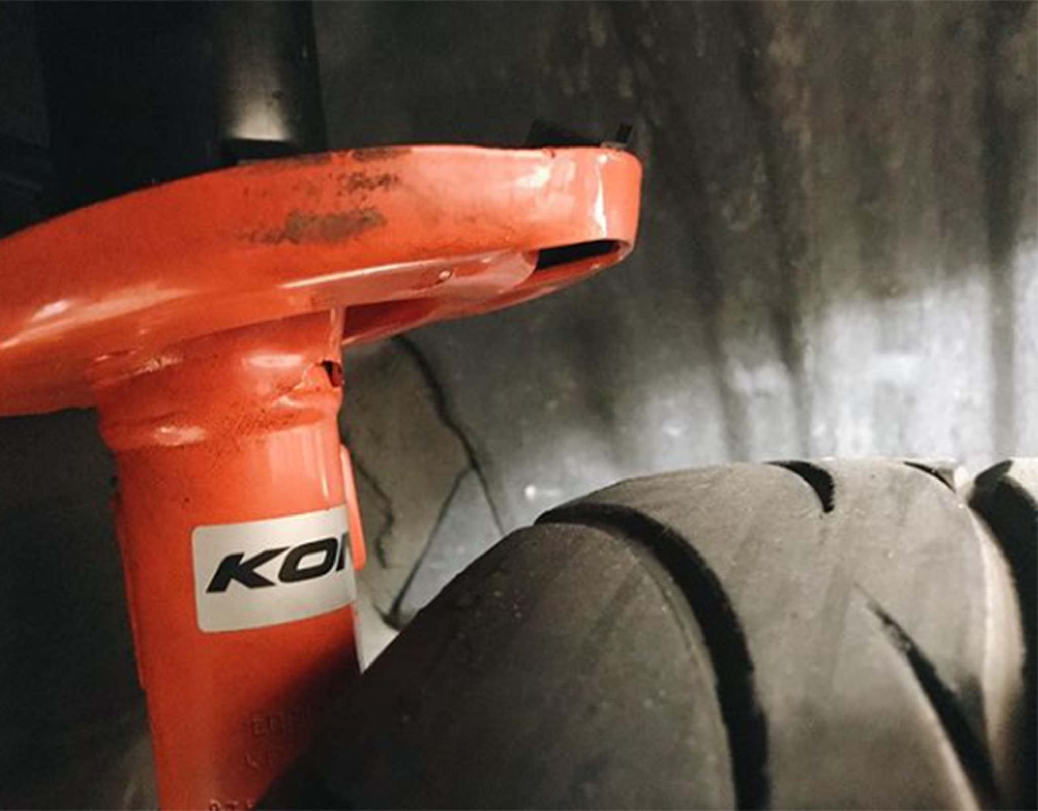 All I had to do next was put the pre-assembled Koni shock and H&R-spring combo in place, flip the switch on the impact, and ugga-dugga it all nice and tight. Done. Next, I picked up the wheel, slid it on… Only to find the shock’s spring perch sitting way the hell out, right above the tire tread. There was no way the perch wouldn’t sit on the wheel once I finished up the other side and lowered the car down, this puppy was way too big. Not even messing with the camber would’ve solved my issue.