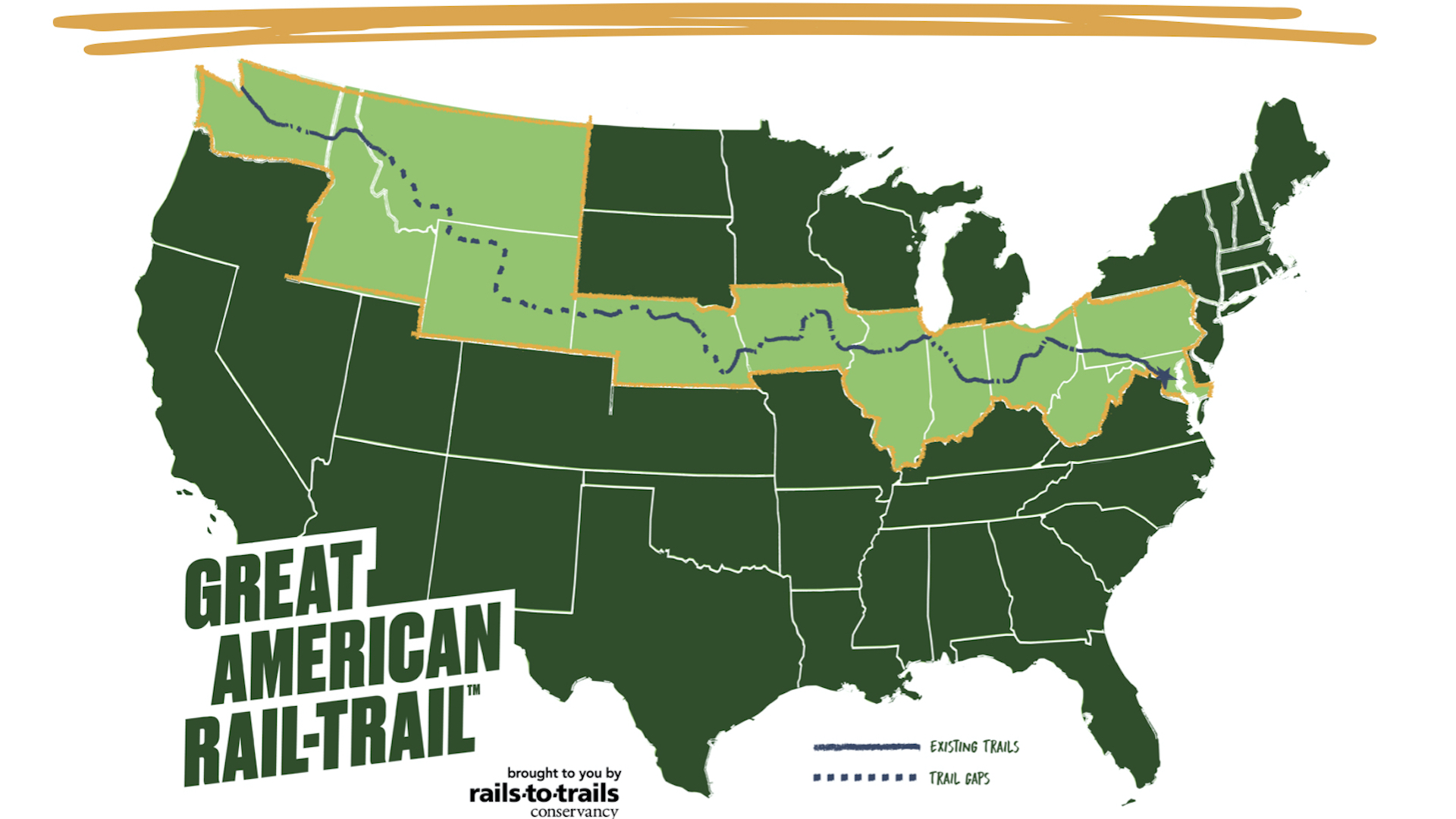 This project of the Rails-to-Trails Conservancy, which repurposes abandoned railroad lines as multi-use trails, is planned to be a more than 3,700-mile route linking Washington D.C. with the Pacific coast’s Olympic National Park.