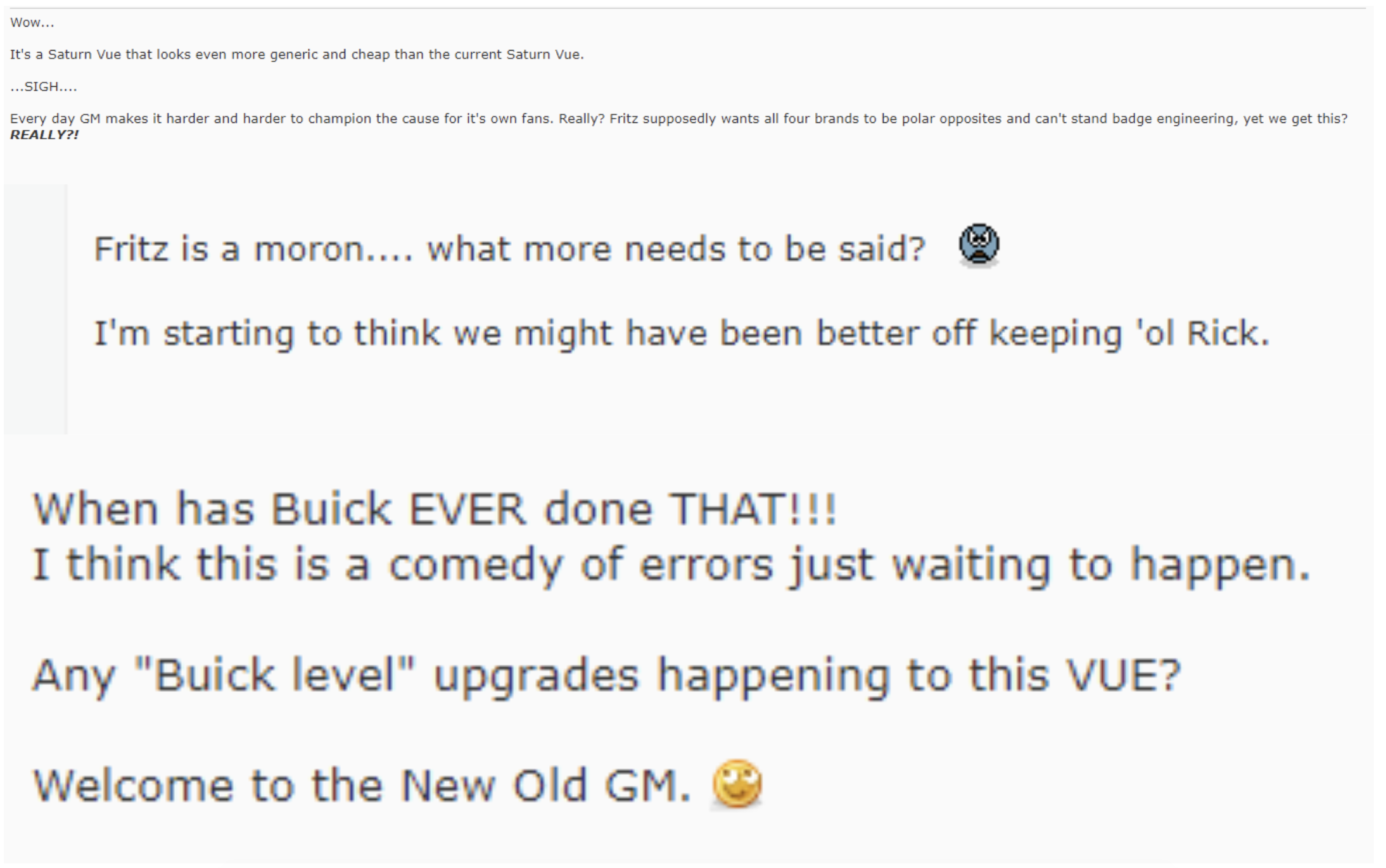 GM was sort of reselling restyled vehicles from their European arm, Opel, but the success of them was mixed to not great. Opel’ized Saturns were not necessarily bad cars, but it seemed like GM just sort of stuck them over at the wrong brand.