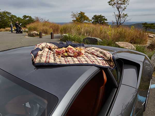 Atop Bear Mountain, a pair of leather-clad bikers approach us. The Harley rider of the duo is drawn by the Lamborghini, but he flips out when he learns who’s in charge of the picnic.