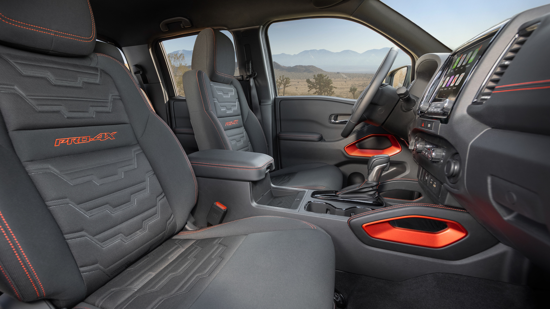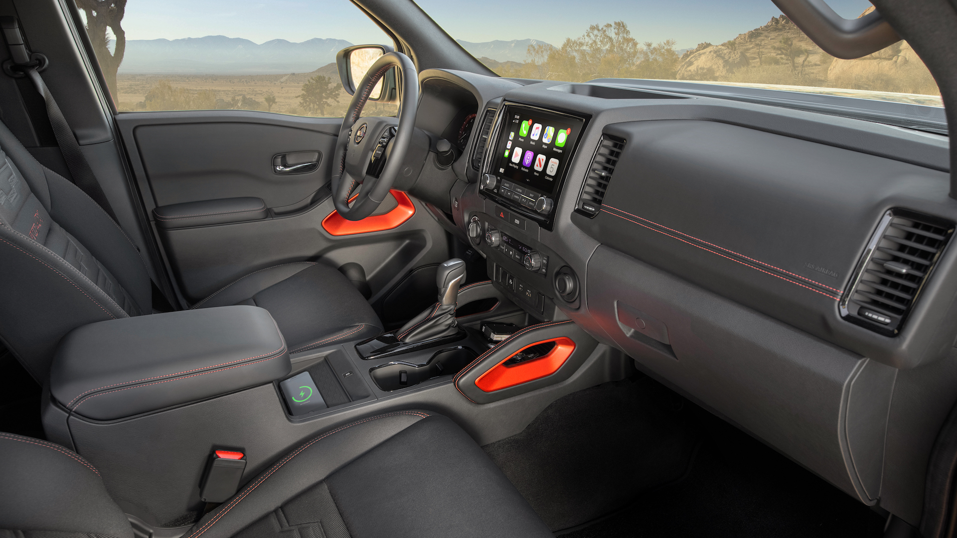 Just like the exterior, the 2022 Nissan Frontier’s interior has also been thoroughly redone. Inspired by adventure gear, the new cabin features an available nine-inch infotainment touchscreen—the biggest in the class, apparently—with Apple CarPlay and Android Auto. Wireless charging is available on the Pro models. As for wired charging, two USB ports (one USB-A, one USB-C) are standard as are two 12-volt outlets. Two 110-volt, 400-watt outlets (one in the rear, another in the bed) can be had as an option on SV and Pro models.