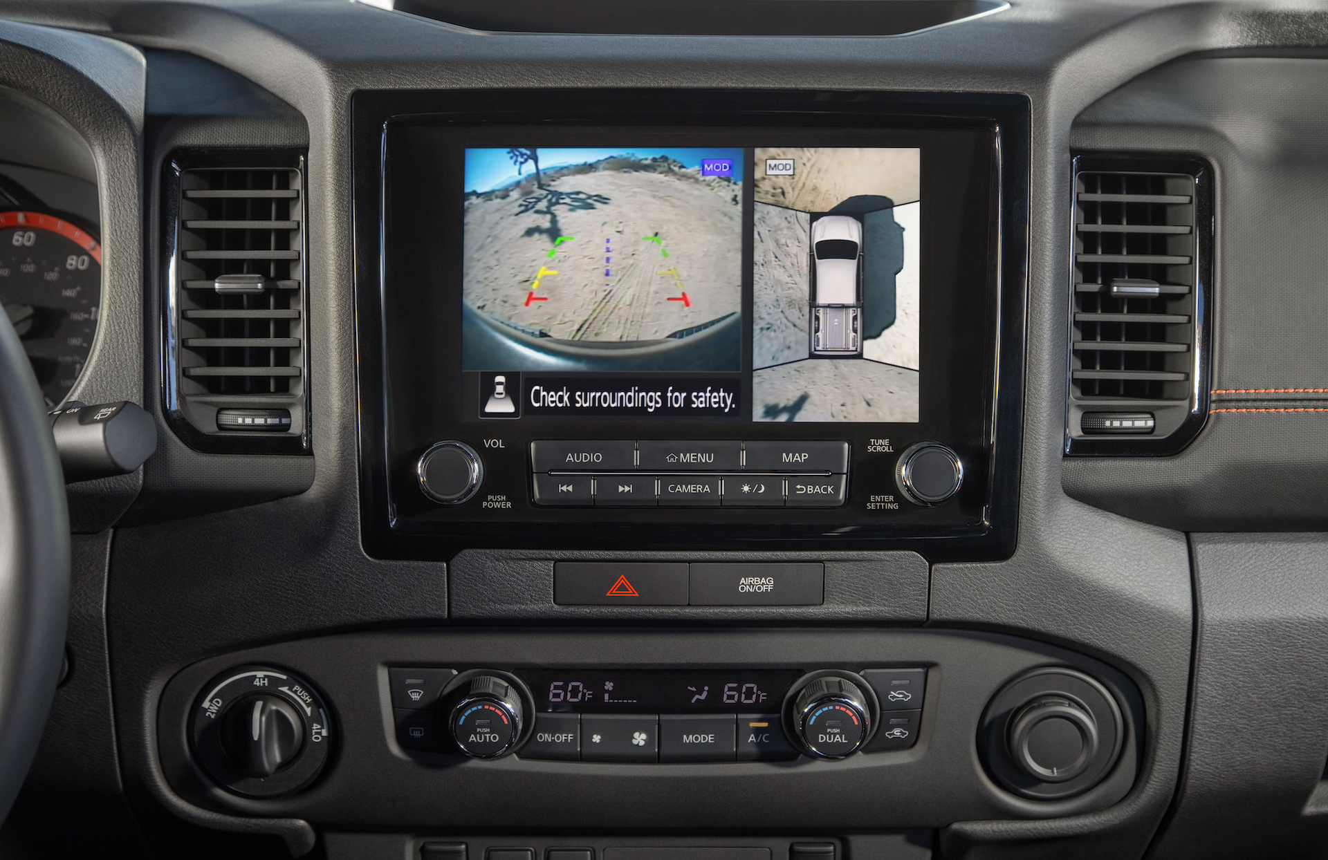 The new Frontier will be the first Nissan to get the company’s Intelligent Around View Monitor with Moving Object Detection as well as Off-Road Mode. The former uses four exterior cameras to piece together a bird’s eye view while the latter engages at low speeds in 4LO and essentially replaces a human spotter.