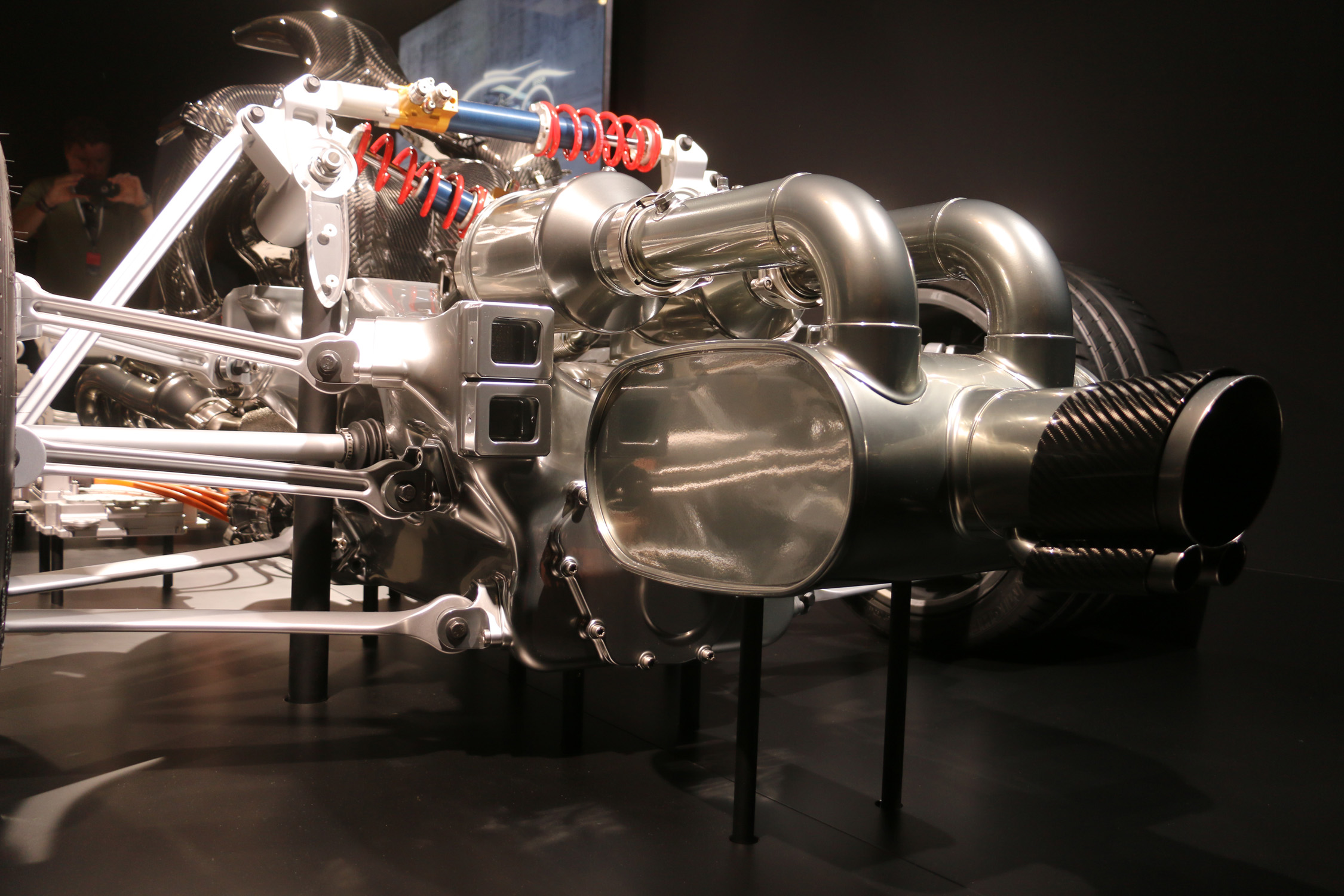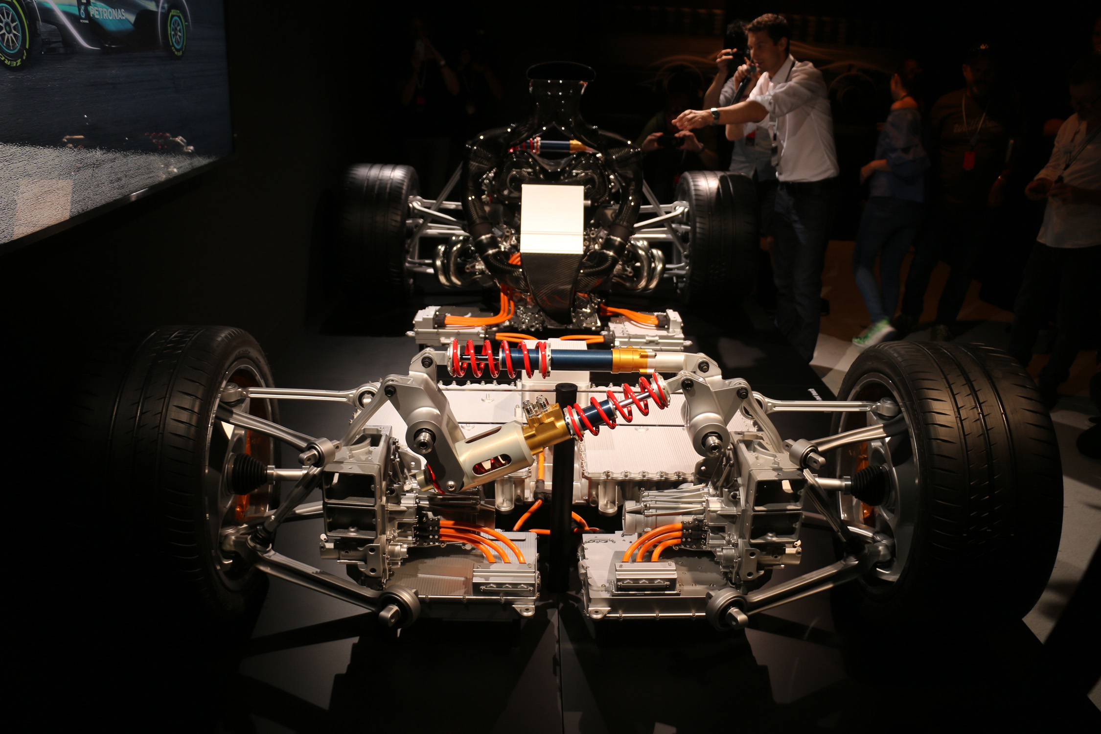In 2017, less than a year after the announcement and just before the Nürburgring 24 Hours, we had an early chance to take a look at the AMG Project One’s chassis, including its 1.6-liter V6 turbo, complex exhaust, battery packs, electric motors and pushrod suspension. Check out what that early rolling chassis mockup looked like: