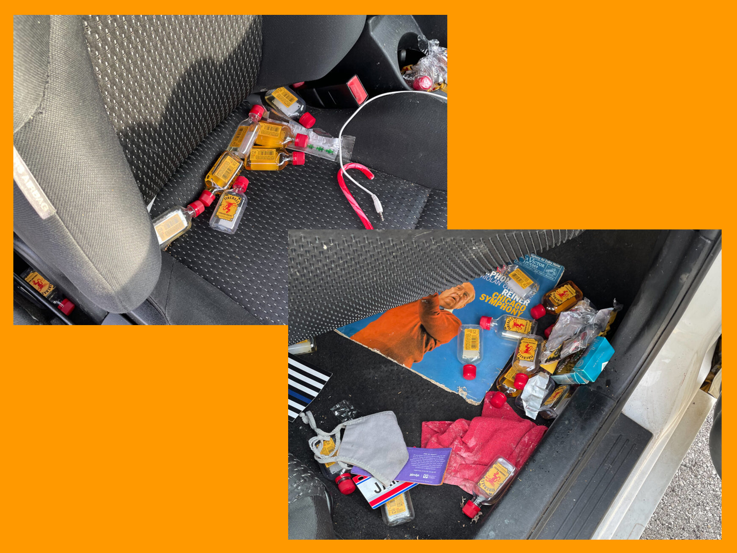 The interior was filthy, full of cigarette butts and mini bottles of Fireball whisky. (Don’t drink and drive, folks!)