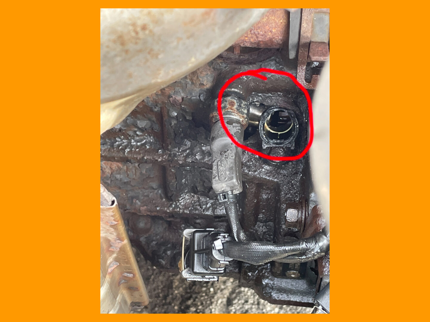 …But if you look closer, you can see a huge hole in the engine block directly next to where the sensor should plug in. You can see the crankshaft, and what looks to be a connecting rod sticking out.