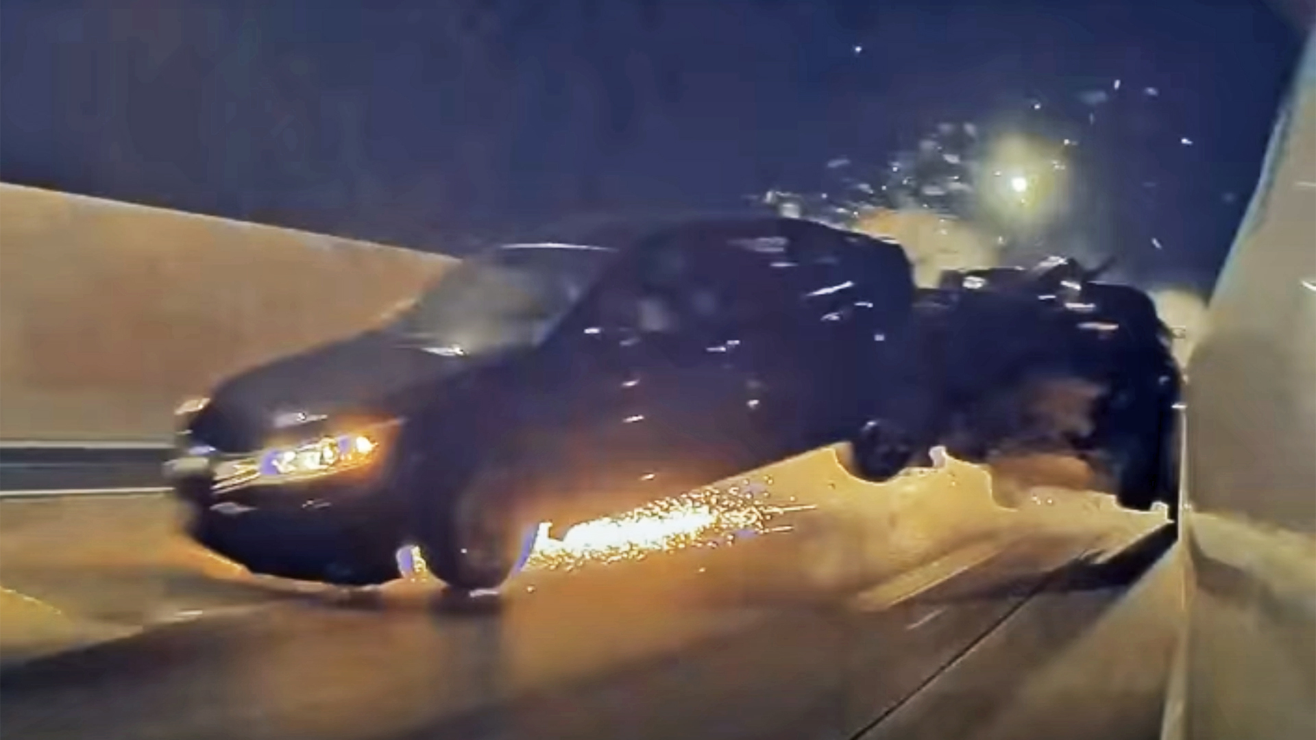 The Challenger then passes a large SUV, which looks like a ninth-generation Chevrolet Suburban, by cutting into the right lane. As the Dodge does this, the Model 3 exits the left lane and effectively hides behind the SUV. It appears that the driver of the Challenger may have meant to cut into the same lane as the Tesla, but was caught off-guard by the Model 3’s abrupt change and instead rear-ended the car in front of it. The 4,400-pound Challenger continued to barrel down the highway and lost control, striking the next car in the lane and sending at least two of the involved vehicles into the concrete barrier on the side of the highway.