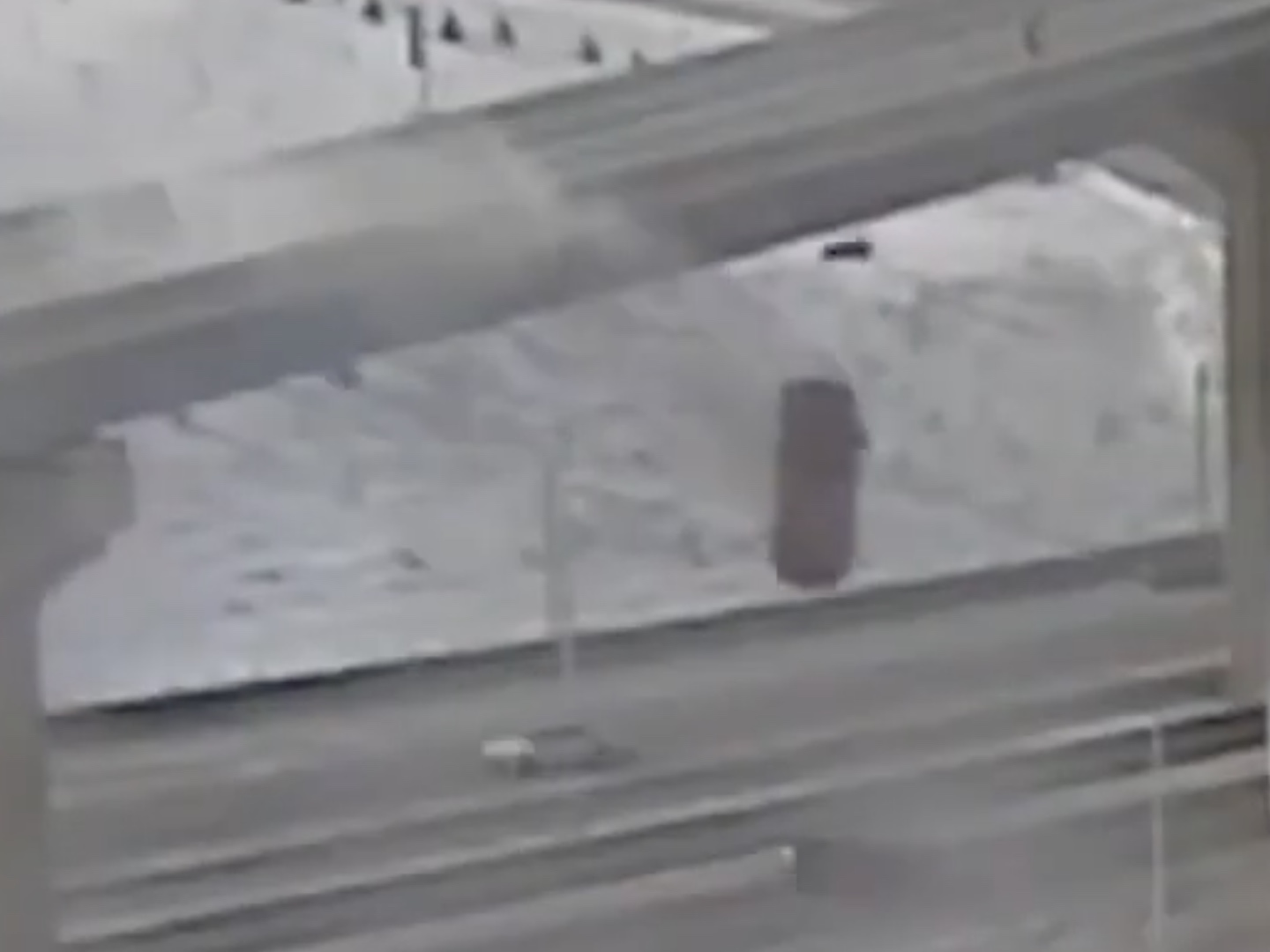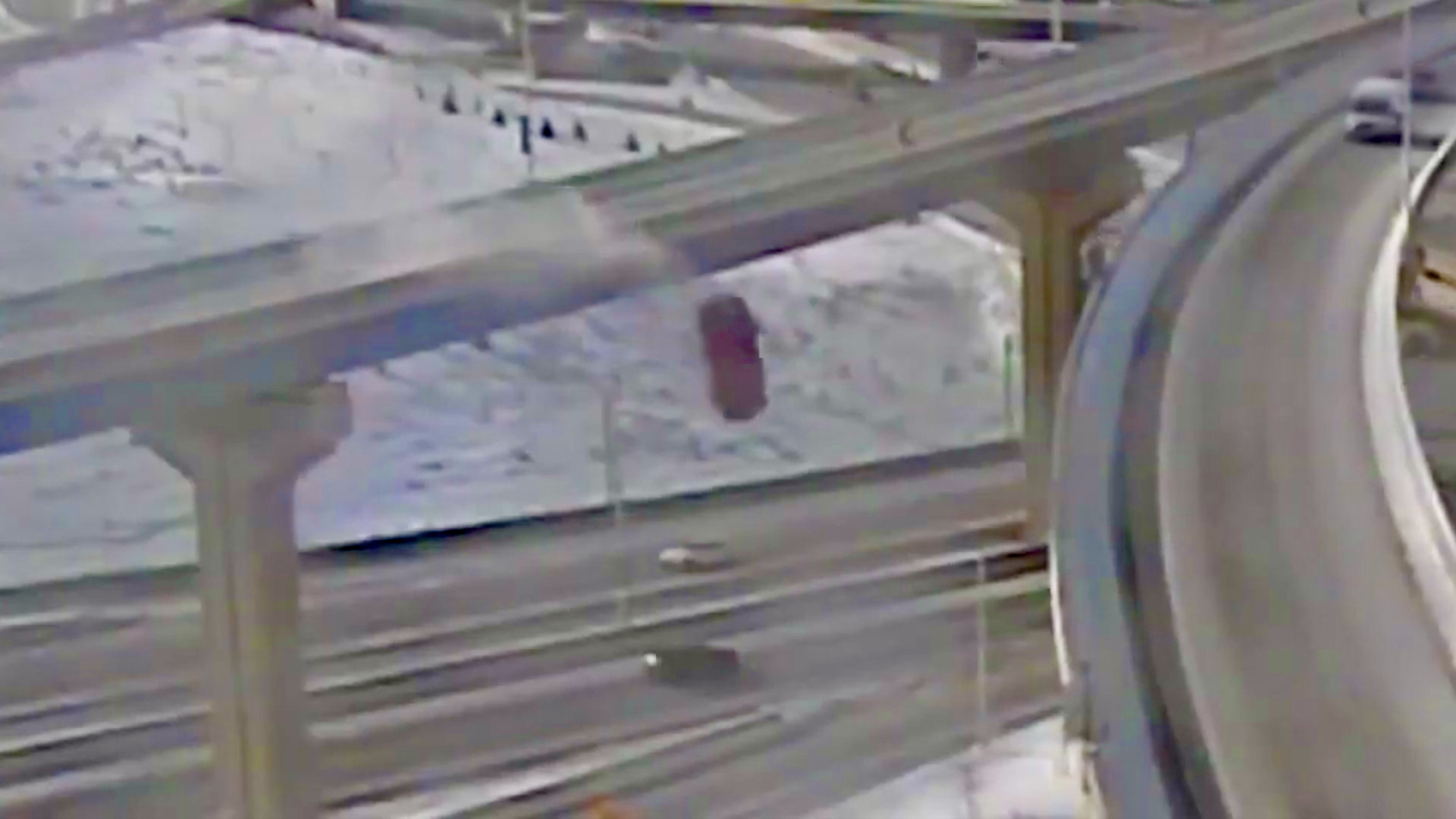 The camera was pointed at Interstate 94’s “Zoo Interchange,” named so not for being the busiest highway interchange in the state, but for the Milwaukee County Zoo to its northwest. On the left side of the frame, a truck appears before sending up a large white cloud, suggesting it hit a compacted, sloped snowbank along the edge of the road. This ramped the vehicle up and over the barrier, sending it on a trajectory to land on the onramp of westbound I-94.