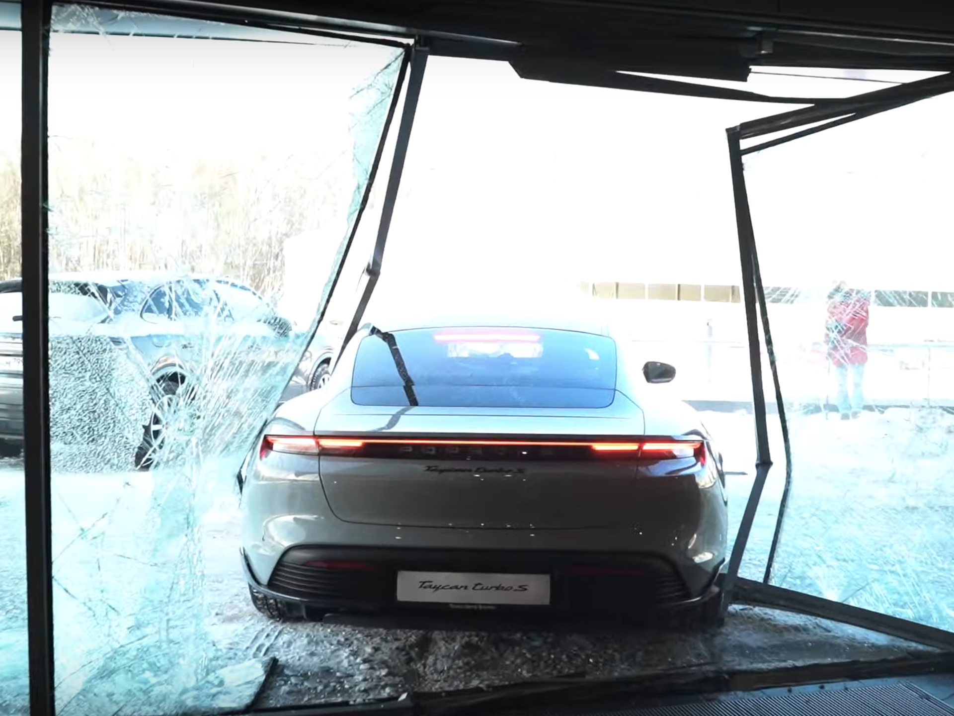 Viral clips of a new Taycan Turbo S speeding out of a Porsche dealership’s showroom and crashing through a window have been making the rounds this week, and it’s all the doing of Russian internet personality Mikhail Litvin.