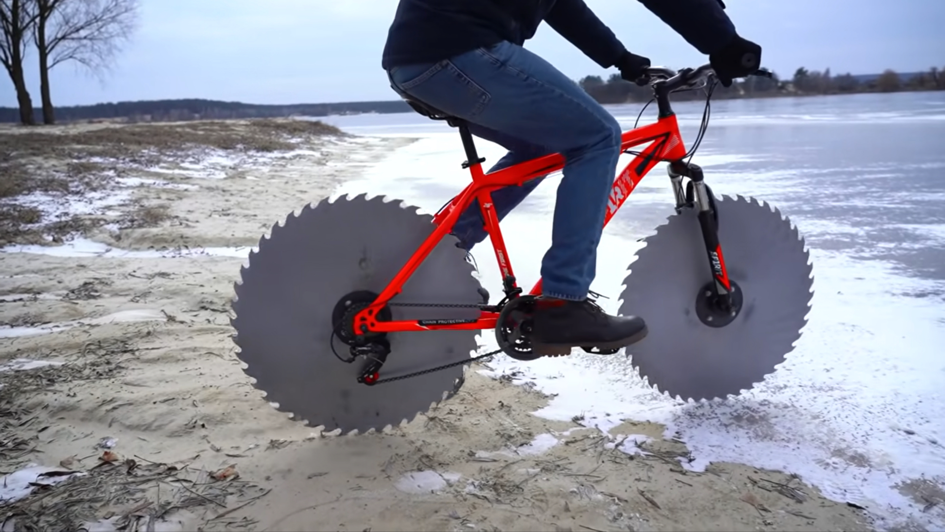 It’s worth noting that studded bicycle tires are real things that exist, and you should probably try those long before you decide to use giant saw blades as wheels.