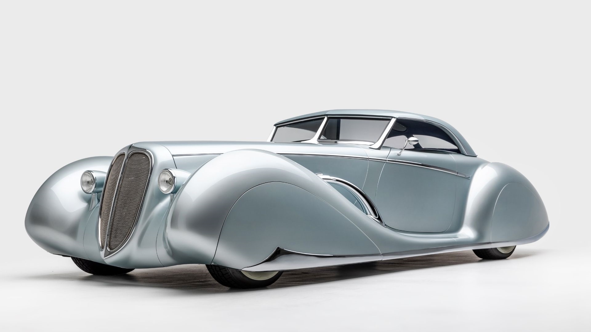 On the Aquarius, all of the chrome was made from brass with the exception of the grille surround and insert (which is stainless steel) and the side-view mirrors. The Dennis Crooks-designed steering wheel was shrunk from a 19-inch to a 17-inch diameter so Hetfield’s fingers wouldn’t hit the dashboard, and the classic gauges were engraved with Aquarius lettering. In total, the only pieces of this car that were not hand-built were the license plate frame mount, side view mirror, rearview mirror, and the wheels and tires. Inside, Aquarius has dark blue leather, installed with a deft touch by Ron Mangus. The steering wheel is a $3500 piece of art on its own. And the exaggerated curves of the fender are styled after the elegant 1939 Delahaye Type 165, which debuted at the 1938 Paris Motor Show. Dore says Aquarius is “French, with an American attitude.”