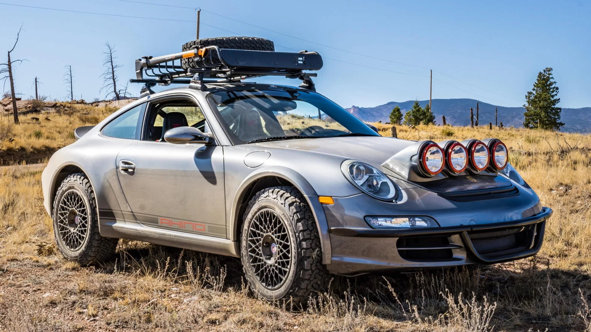 A skidplate now adorns the underside of the engine, and there’s some tube metal cladding on the front and rear of the car to protect the bumpers. Speaking of the bumpers, the front is a new one in the style of a 911 GT3 from Rennline and the front fenders are flared in the GT3 cup style. The car also gets those eye-catching rally lights on the hood, a new ducktail spoiler, and decals that say “RHINO.” For reference, below is what the car looked like before all of these mods.