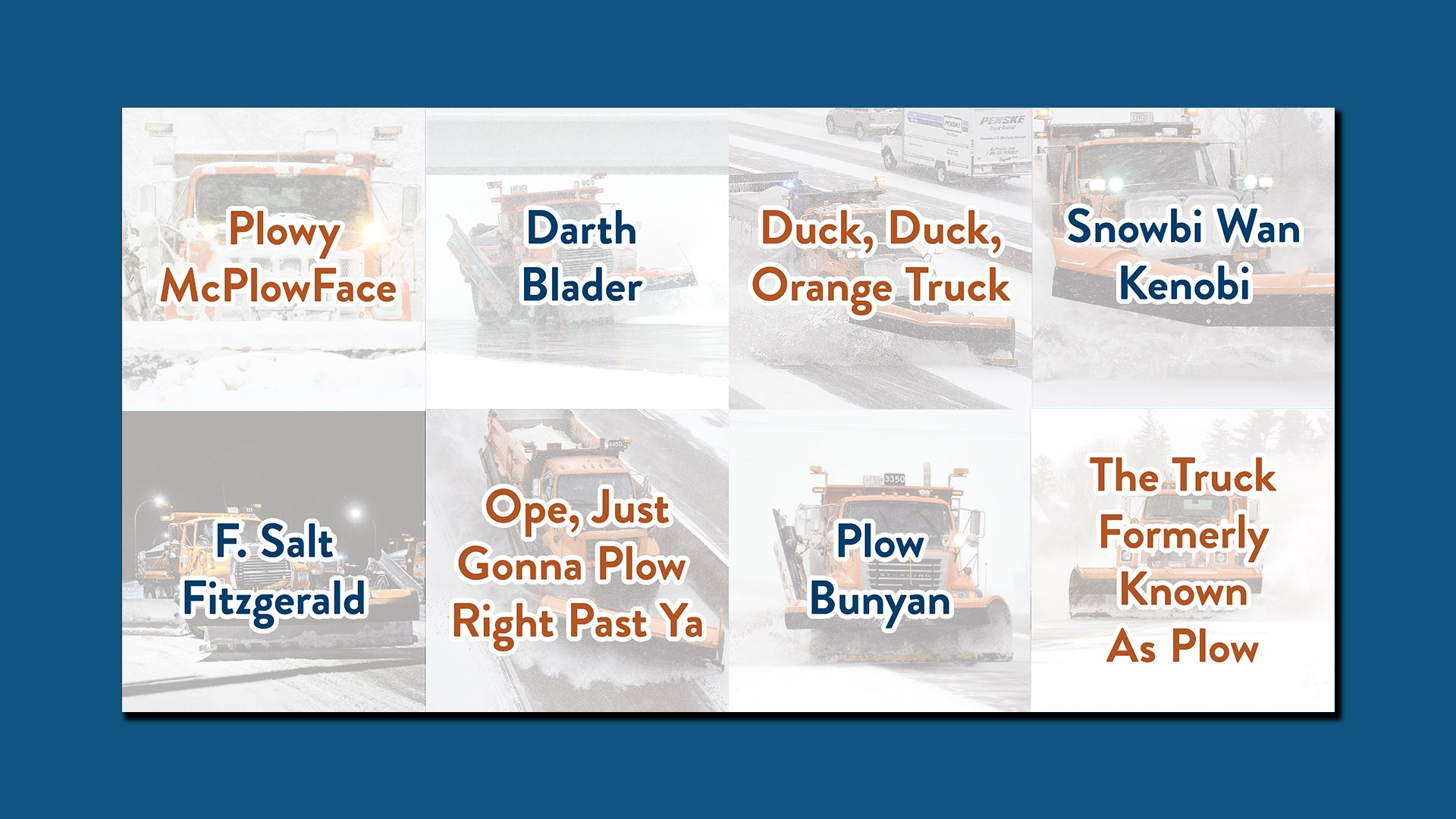 The other seven winners were Ope, Just Gonna Plow Right Past Ya; Duck Duck Orange Truck; Plow Bunyan; Snowbi Wan Kenobi; F. Salt Fitzgerald; Darth Blader; and The Truck Formerly Known as Plow.