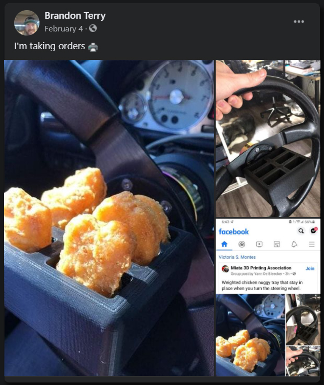 You might remember this hero who DIY’d Koenigsegg-like Freevalve tech onto his Miata—that’s certainly a more practical or performance example of 3D printing used in car modding, but as a polar opposite counterpoint, sometimes people print completely ridiculous novelty items like this weighted six-piece chicken nugget tray that attaches to the center of an aftermarket steering wheel.