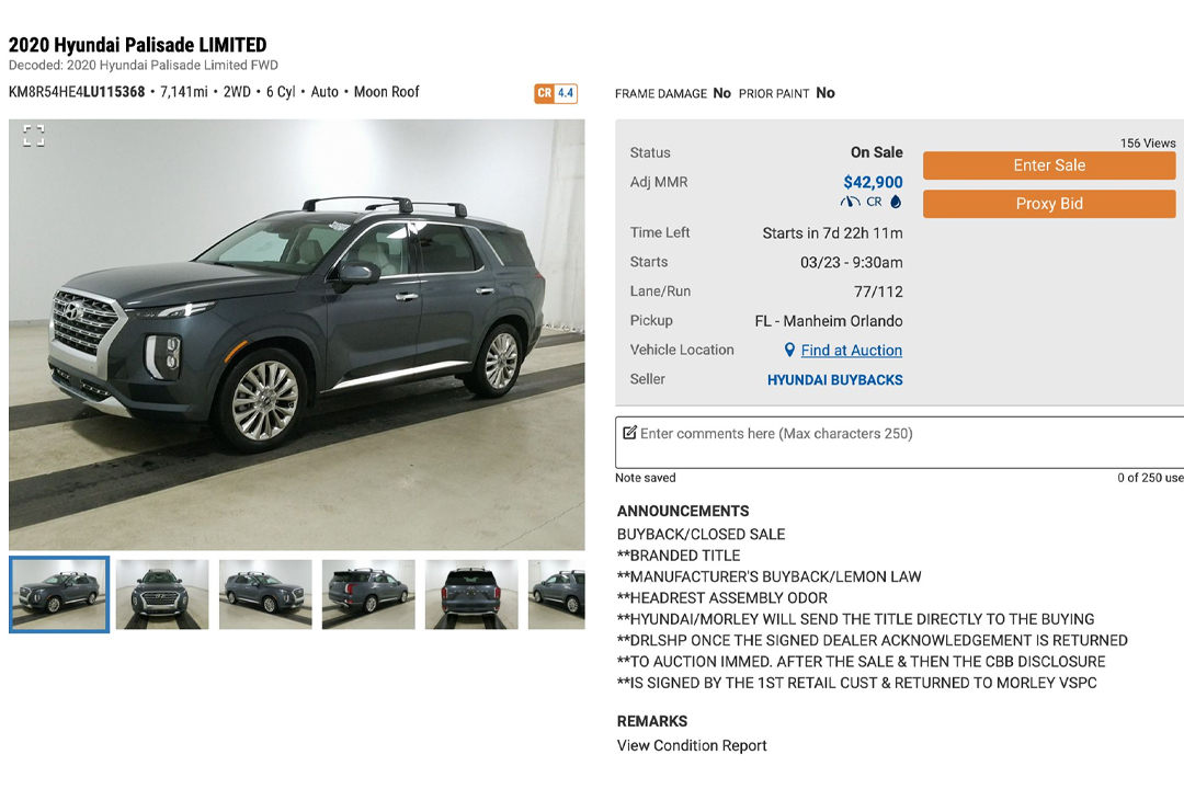 This Palisade popped up for sale at Manheim auction in Orlando, Florida recently, noting that it was a manufacturer buyback vehicle under state or federal-level Lemon Law. Buried inside the small wall of text is a detail that we’re intimately familiar with at this point: headrest odor.