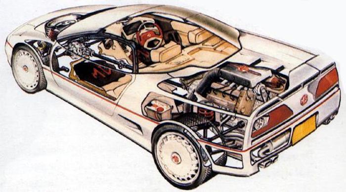 Loosely resembling 1984’s Pininfarina-penned Honda HP-X concept, this bubble-canopied concept borrowed its drivetrain from MG’s Group B rally car, the Metro 6R4. Mounted amidships was a loosely Cosworth DFV-related 3.0-liter, naturally aspirated V6; a screamer of a motor in race trim, and still a potent one in milder tune, making around 250 horsepower according to MGCars.org.