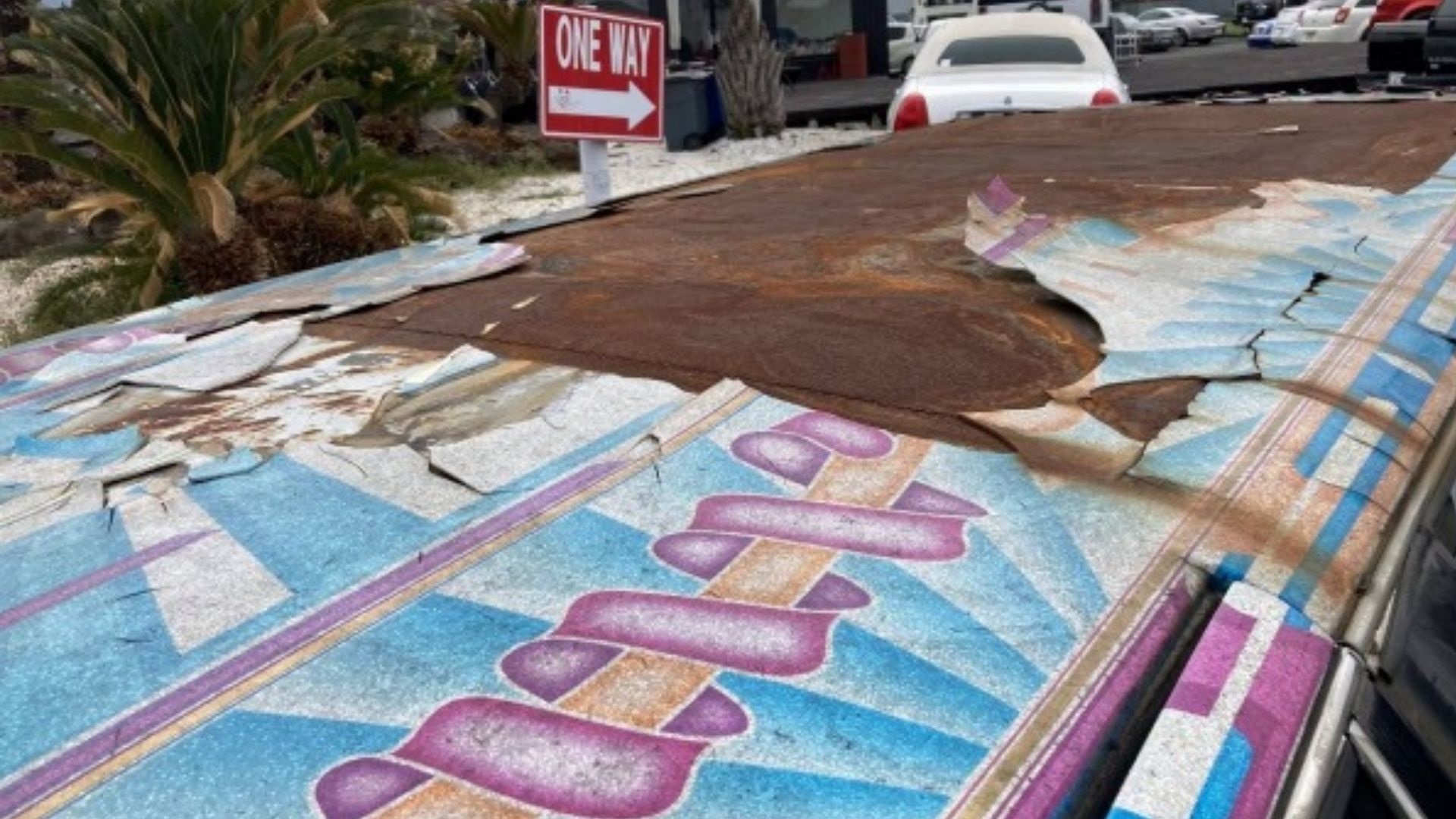 The trunk suggests it has been in some kind of high-speed chase or hijinks reminiscent of the movie The Hangover. It’s more than a little worse for the wear, with a rusty roof and cushions that look like they’ve seen a lot of backsides. Its description is listed as “multicolor,” which is truly an understatement for this riot of hues, swirled in blue, pink, orange, green, and a fetching shade of fuschia. This 1994 Cadillac Fleetwood Brougham limousine is for sale in Japan and it’s something… special.