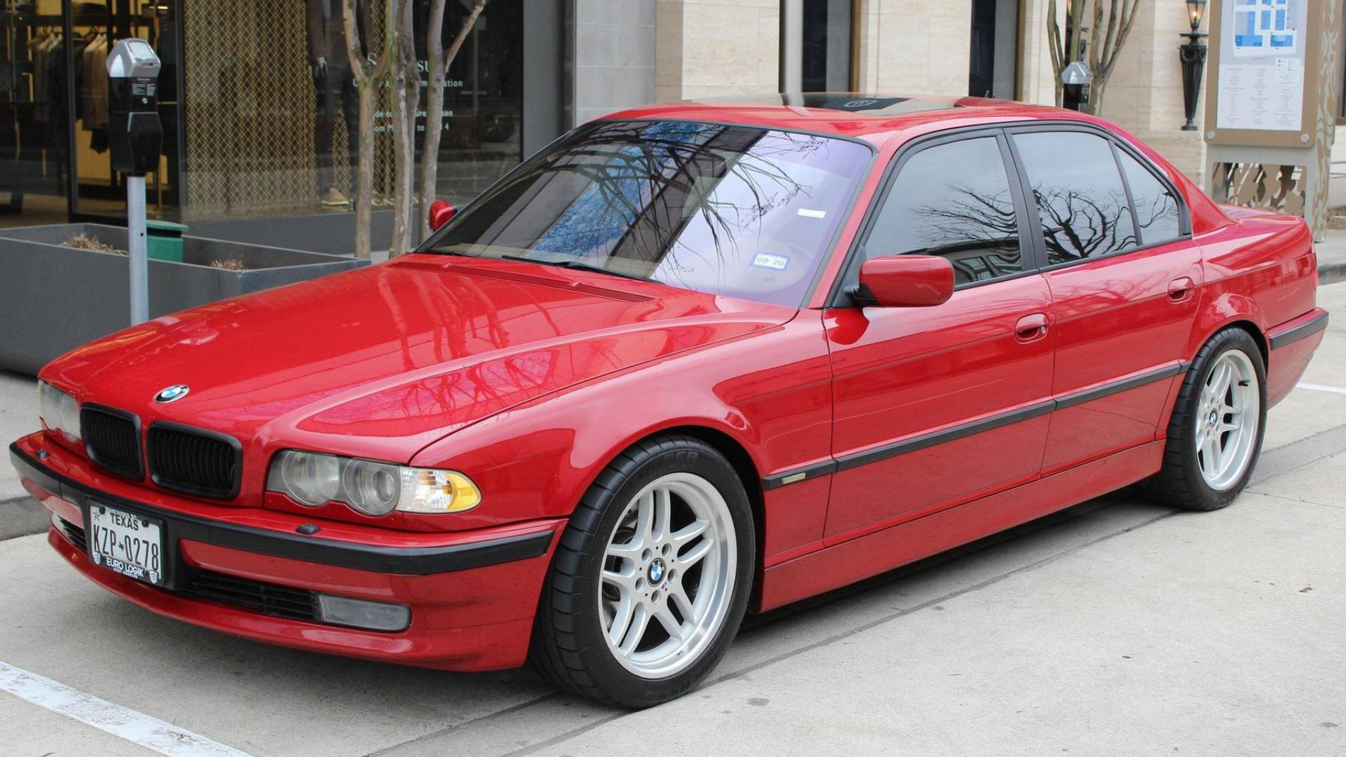 Yes, this rare, Imola Red, short-wheelbase 7 Series is sending 395 horsepower to the rear wheels thanks to an S62 V8. As well as getting this new motor, the car also received a new ECU and exhaust system from reputable BMW tuner Dinan. It’s been lowered with Eibach springs and converted to coilovers in the rear courtesy of KW. The steering box and instrument cluster from the M5 have been swapped in, as has an M5 steering wheel and head unit.
