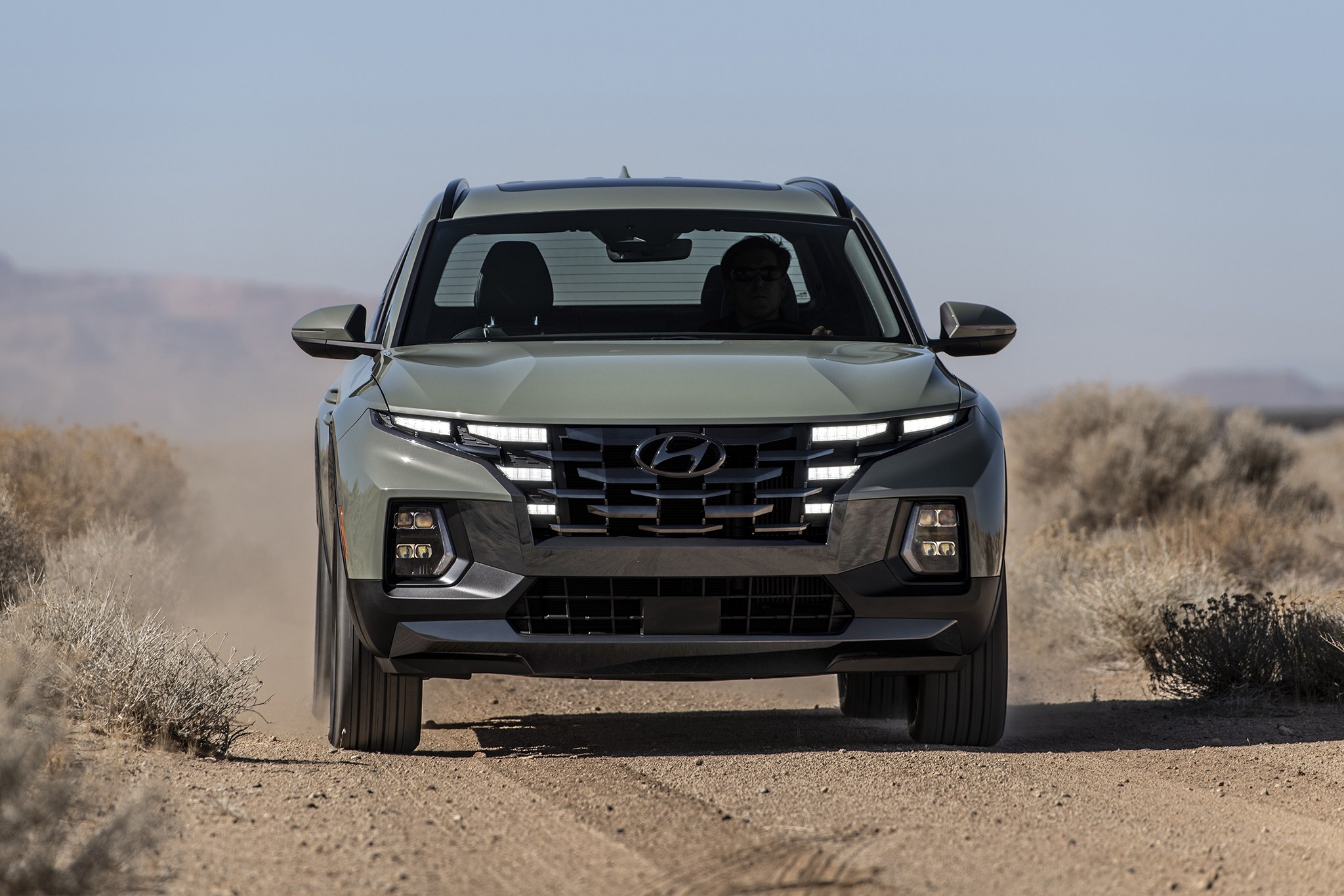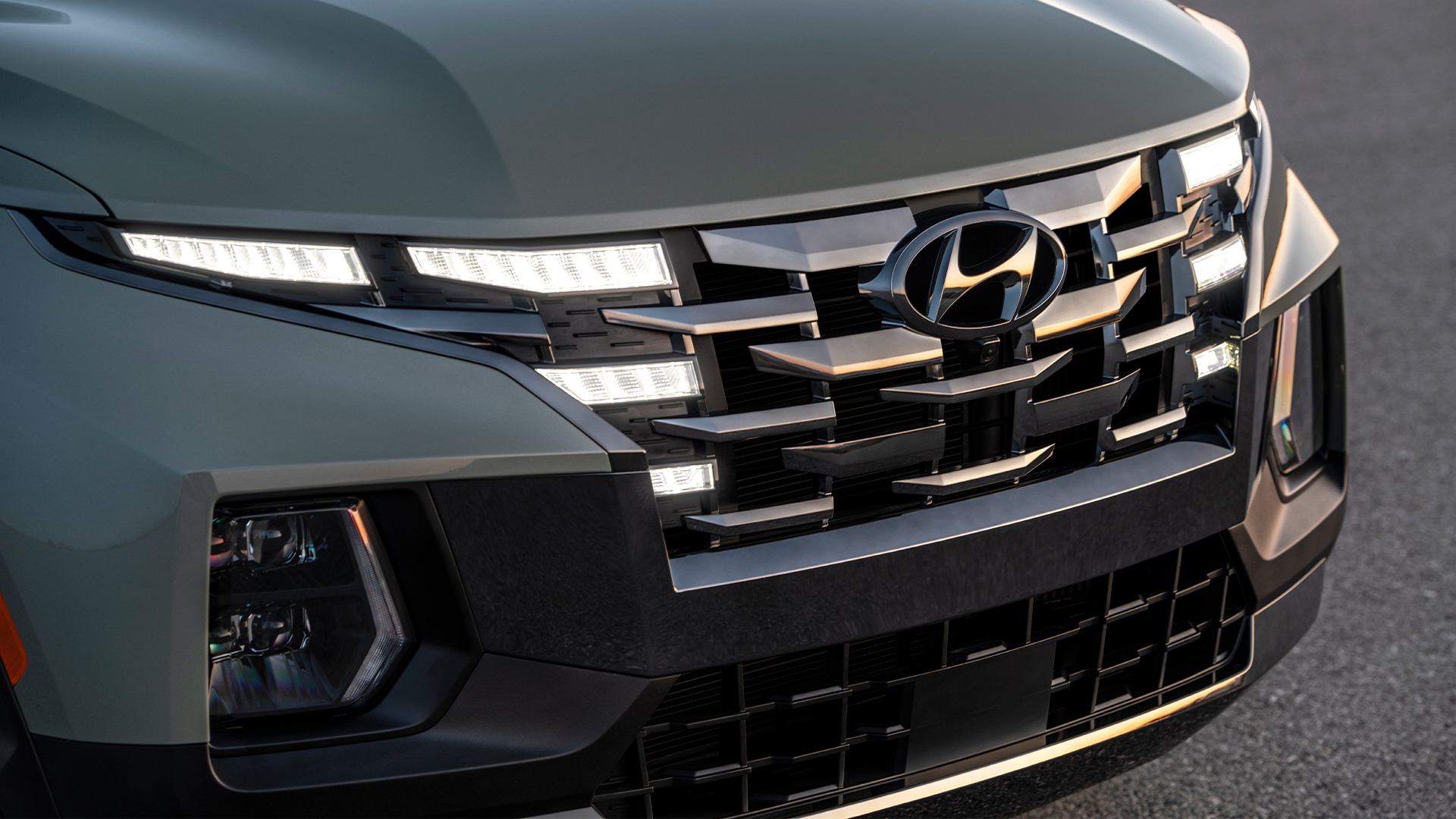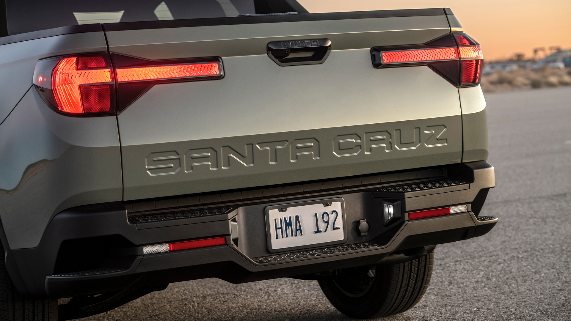 The Santa Cruz’s cascading grille is cleverly backlit to give it a recognizable face by way of those daytime running lights. The headlamps are actually down, on each side of the grille—it’s a tough look, especially at night. They’re complemented by the T-shaped “Thor’s Hammer” taillights while the entire design is equally angular, giving it a charging look even when strolling through town or, as Hyundai would rather you picture, cruising on a sandy trail.