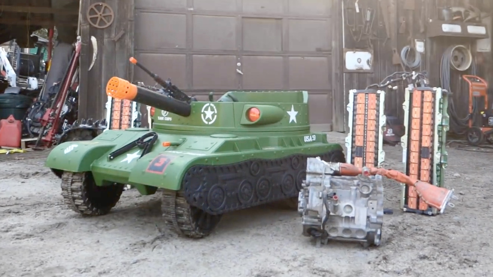 As inspiring as a workshop like Singer’s may be to visit, there’s probably no shop out there that can beat Grind Hard Plumbing Co’s for sheer fun. The Indiana-based YouTubers have constructed a variety of ludicrously powerful kids’ vehicles, from a dirt bike-powered, tube-framed Disney Jeep to a miniature Chevy Camaro with an ATV engine and treads. Apparently, though, these weren’t self-endangering enough because for its newest build, Grind Hard is stuffing drivetrain components from full-size electrified vehicles into a Power Wheels tank.