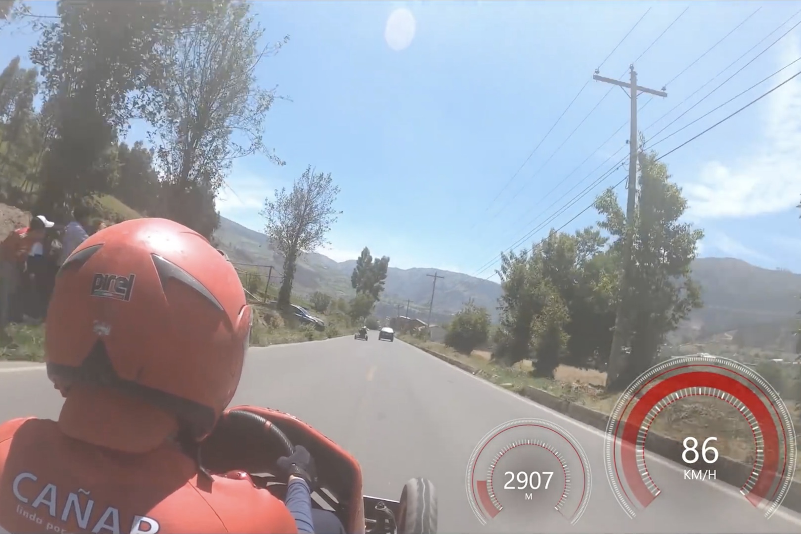 Above them sit their pneumatic-tired cousins, which touch the upper 40s. Then come “free force” prototypes with metal frames, composite bodies, and four-wheel suspension that can exceed 60 mph. And as shown in onboard footage from prototype-class Coches competitors Marco and Cesar Zumba, these cars can haul ass on all surfaces.