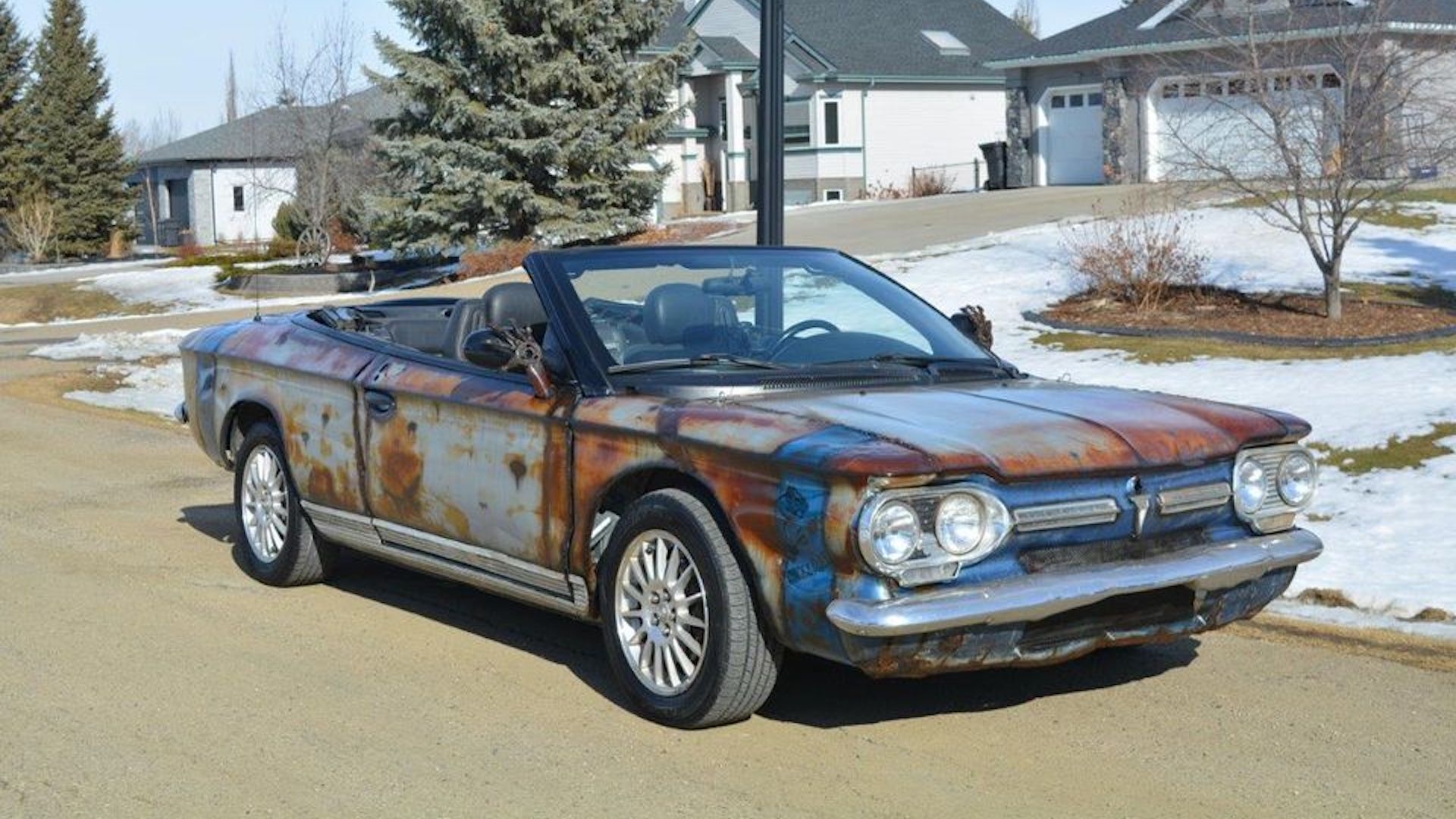 We’ve seen a lot of questionable custom automobiles over the years. I’m sure there have been cars worse than a Chrysler Sebring with the body of a Chevy Corvair and airbrushed patina, but I can’t seem to remember what they are at the moment. But there’s gotta be, right?