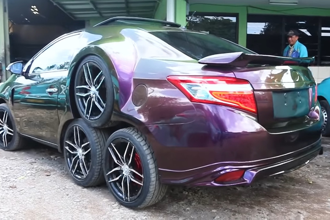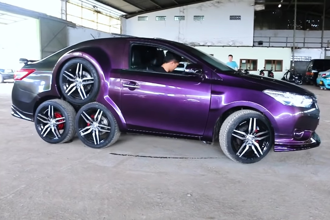 We’ve seen all kinds of modified cars over the years; everything from high-performance stripped out track weapons to wild donks and crazy jacked-up safari builds. What we haven’t seen is cars with lots of extra wheels that serve no legitimate purpose whatsoever. This heavily-modified Toyota Vios has those in spades.