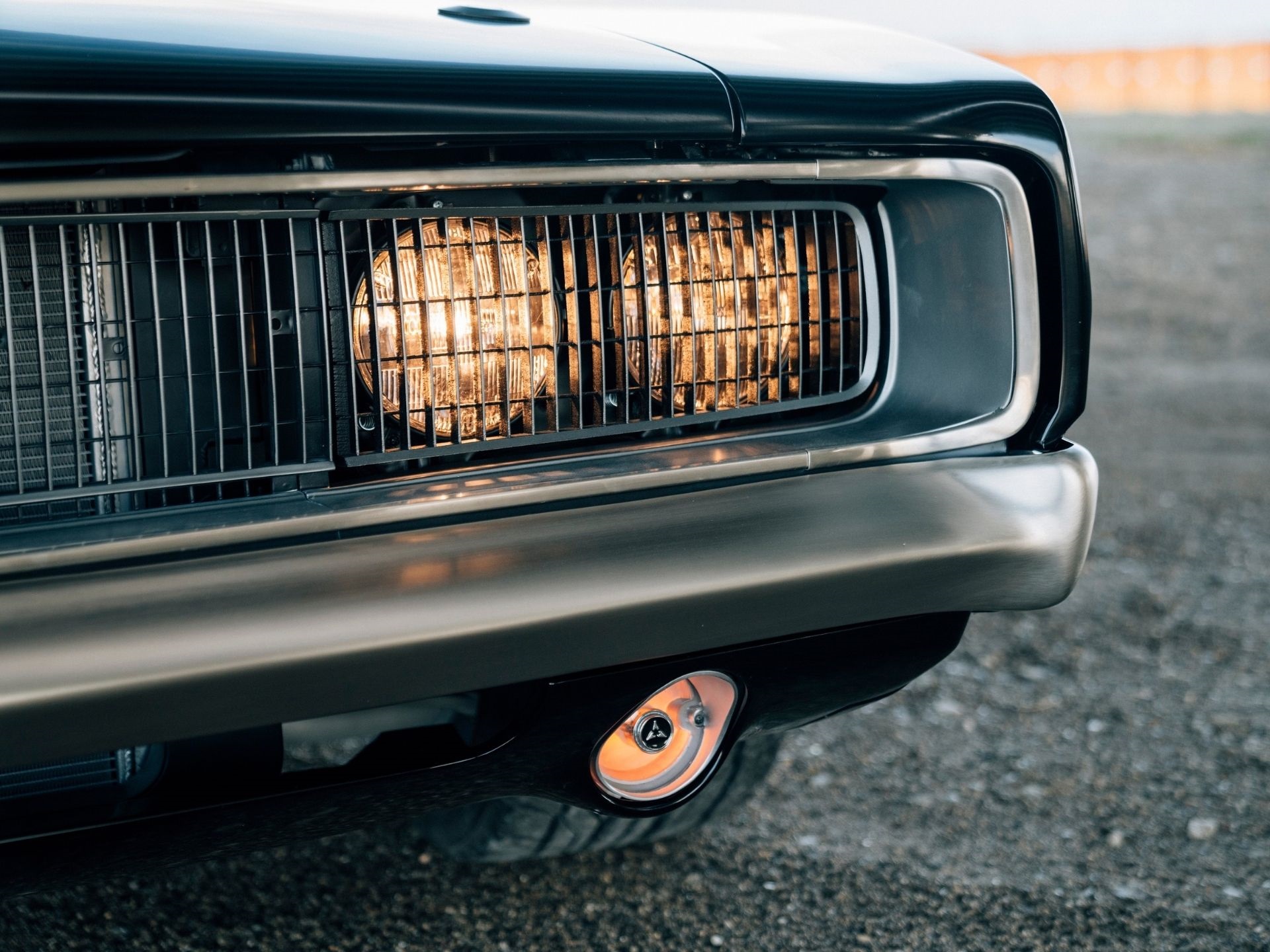 Rendered in full carbon fiber, Hellacious has a custom wide-body treatment by Sean Smith Designs. A glass rear hatch shows off the engine compartment, framed by BASF matte-black paint. I’m smitten with the vertical-slat grille featuring 1968 Charger hideaway headlights.