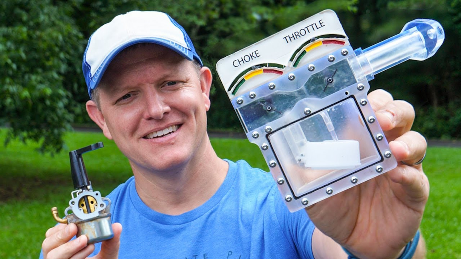 The video came about when Destin Sandlin, the man behind the channel, asked his father to explain to him how carburetors work in practice. This inspired him to build a transparent carburetor so that he could literally see what was happening inside. The device was built using a transparent resin 3D-printed housing for the bowl and venturi, and fitted with a float and needle from a Briggs and Stratton carburetor. Throttle and choke were then installed, made from 3D-printed PLA plastic. The clear carb was then installed on a small single-cylinder engine on a Craftsman garden tiller.