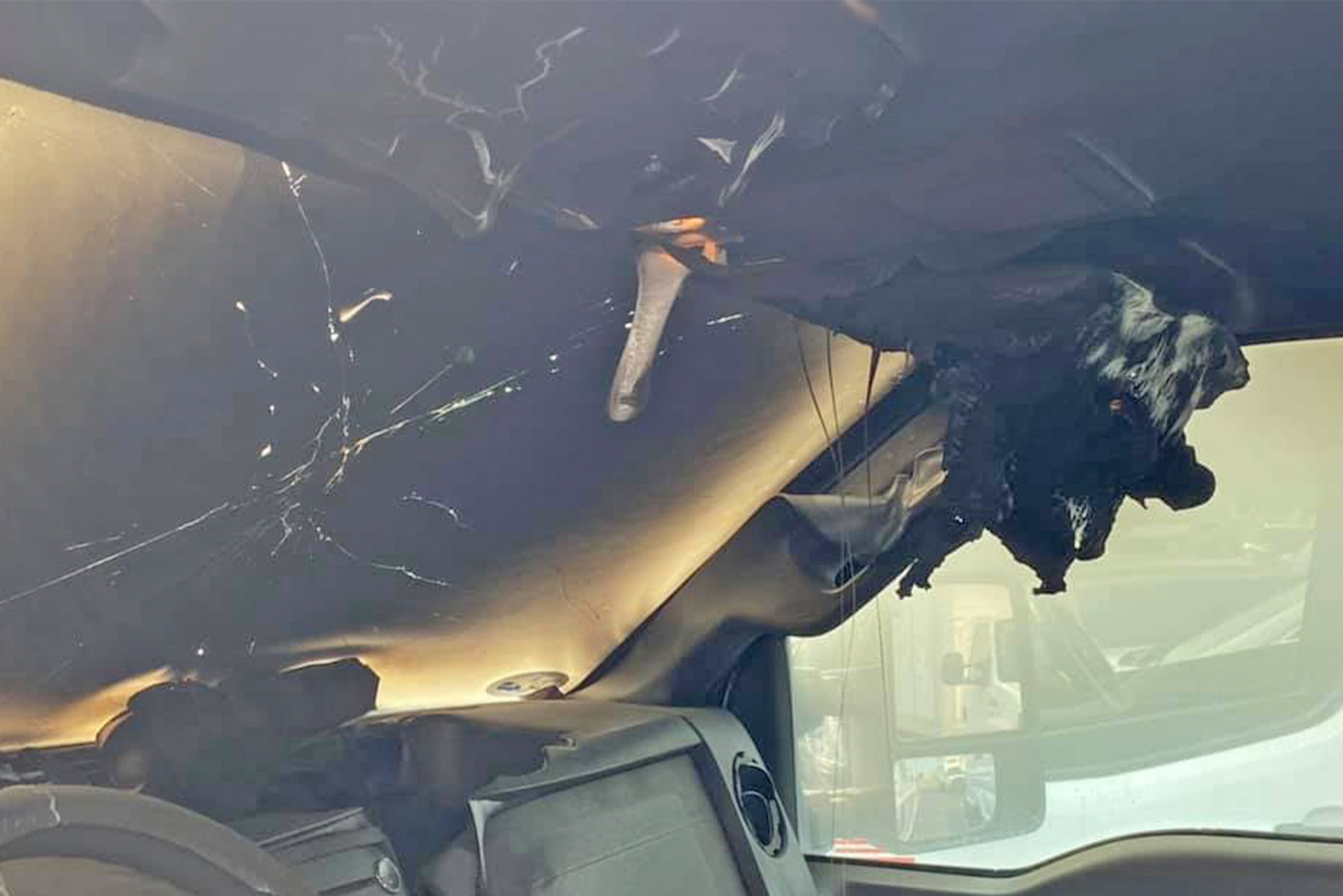 From the outside, it just looks like a cracked windshield; really, though, it’s way more. A view from the driver’s seat shows a blackened and melted mess with that same windshield severely scorched. Luckily, as the original poster Eric Wilkinson explained to The Drive, the truck was unoccupied when it happened.