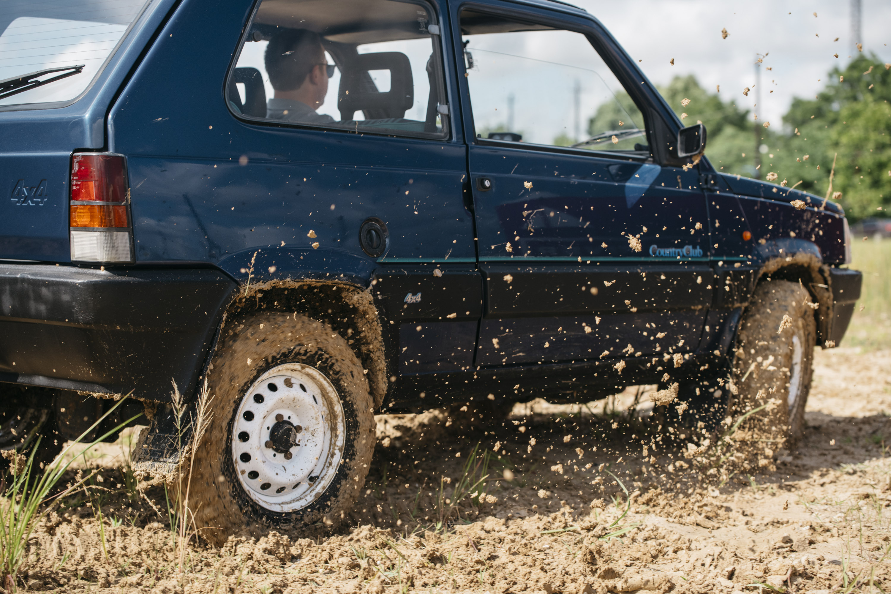Pull a lever between the seats to engage the four-wheel drive, and you’ll hear a mechanical thunk: Steyr-Daimler-Puch mode, engaged. I wasted no time driving straight into the saturated Texas clay, and immediately got stuck. With some fairly tedious rocking back-and-forth using reverse and first, I was able to get unstuck relatively quickly. My novice mistake was being overly cautious and slowing down too much—keep the lightweight Panda moving and it’s unlikely to dig in. Feeling the chassis squirm and flick mud from all four tiny tires was hilarious, unforgettable fun.