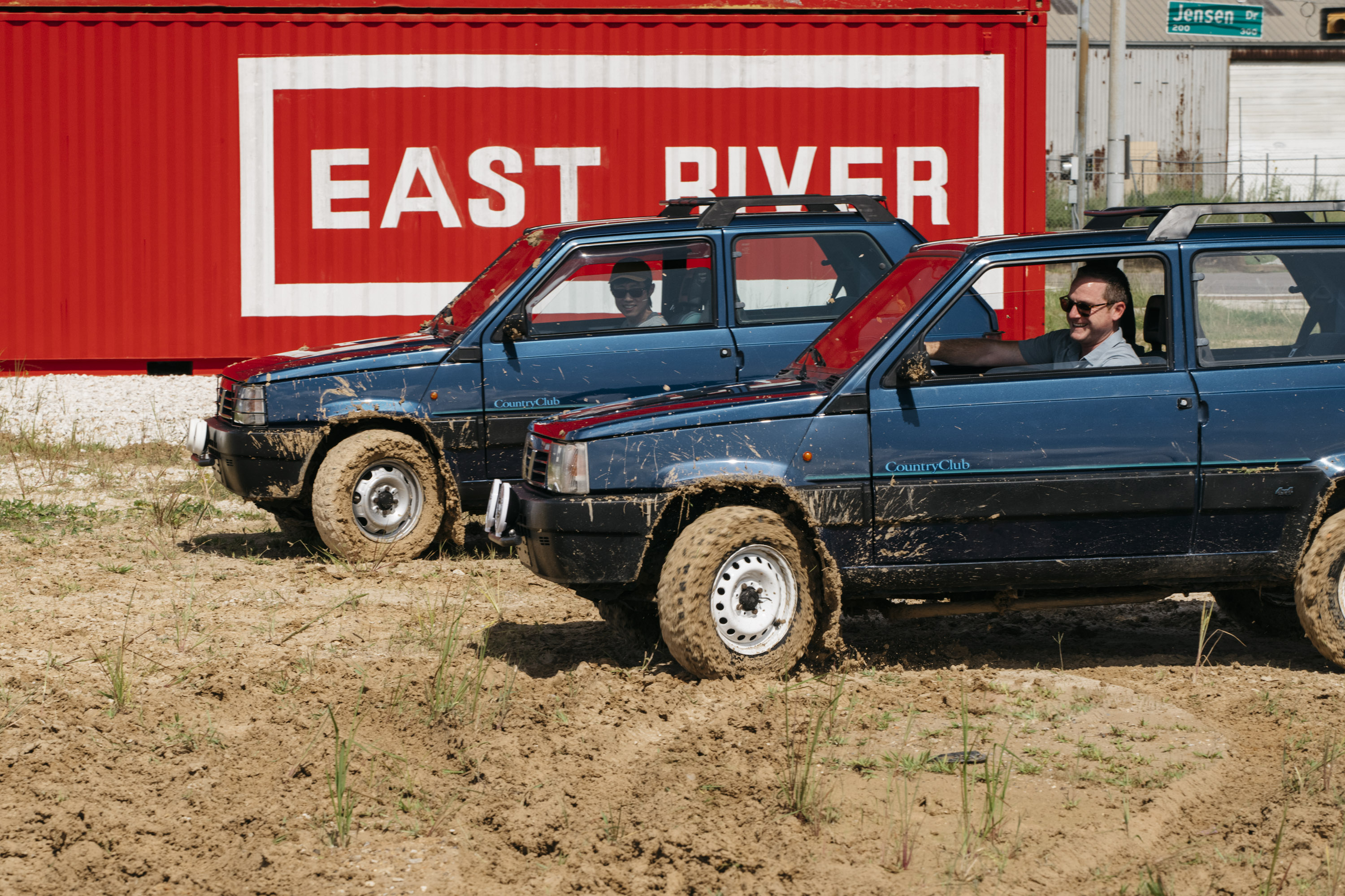 I couldn’t give a full drive impression of the Panda 4×4 if I only kept it on the pavement, especially since power only gets delivered to the front wheels during normal driving. So in the days leading up to the auction, we gathered both Pandas for some urban off-roading. It wasn’t a trail and there were no rocks to crawl, but we at least found some mud to explore the traction limits.