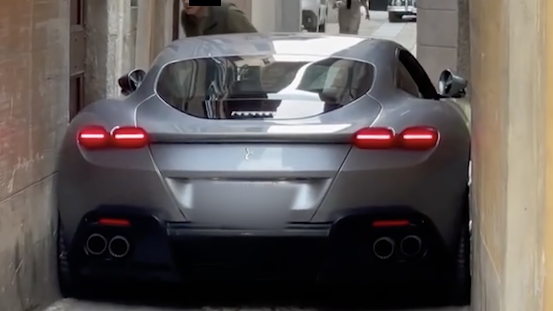 It’s hard to tell by video alone whether the silver Roma’s body actually made contact with stone but, if it did, the paint and bodywork required to restore this Ferrari’s finish (on both sides!) will surely not be cheap; it starts at over $200,000. Measuring precisely 77.7 inches wide (that’s nearly 6’6″), the grand tourer is powered by a 3.9-liter, twin-turbo V8 making 612 horsepower. Not that horsepower matters when you’re clamped between two very hard, very old-looking pieces of Italian architecture.