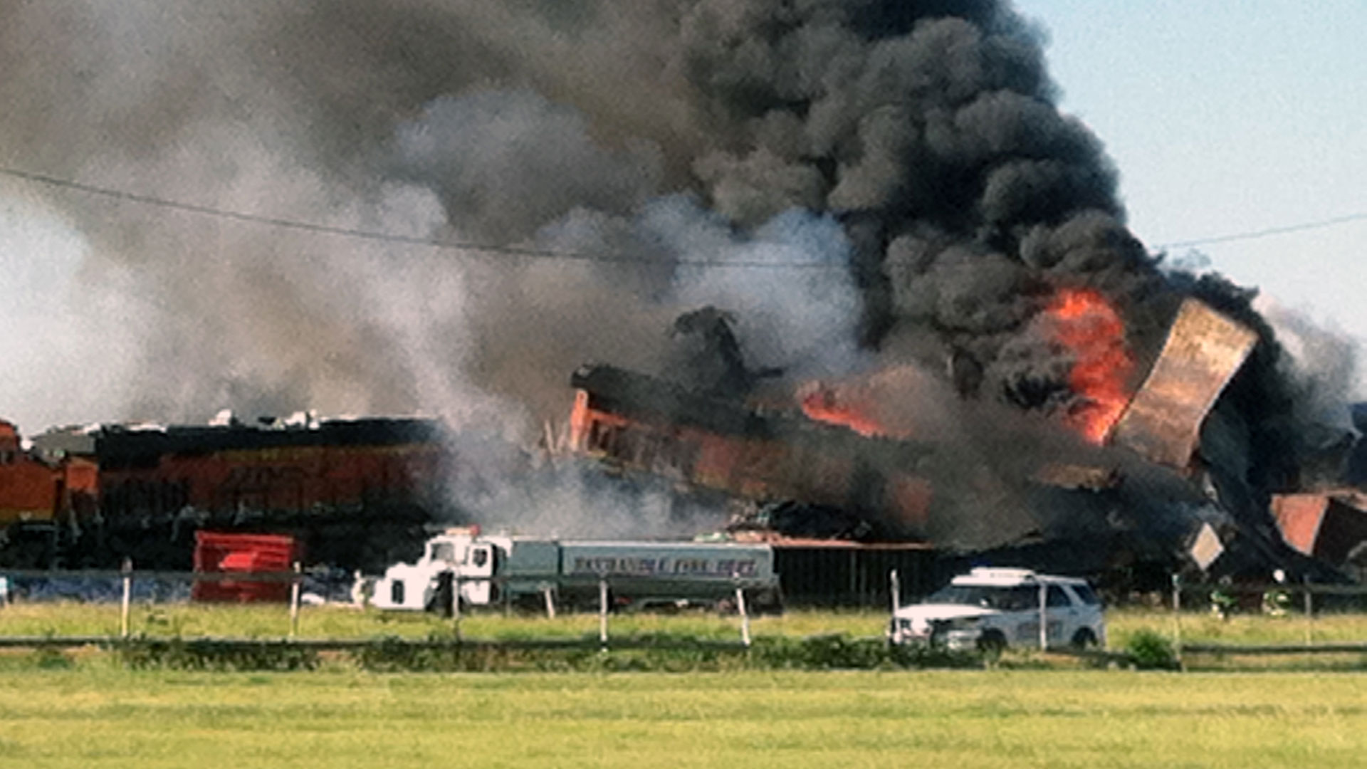 The collision occurred between two BNSF trains around 8:30am on the eastern side of the town of Panhandle, TX. (Yes, there’s a town named Panhandle in the Texas Panhandle.) The trains were traveling in opposite directions on the same track; it is not yet know how fast they were traveling at the time of the accident, but a BNSF spokesperson told the Amarillo Globe-News the speed limit for that section of track was 70 mph. The contents of the trains is not known.