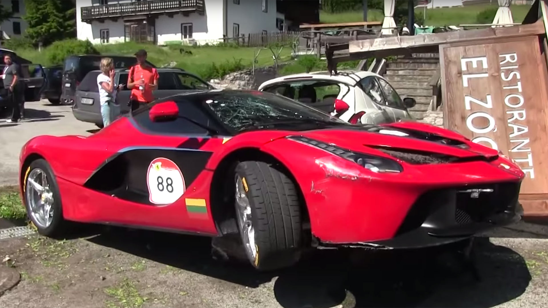 A Ferrari LaFerrari appears to have met its maker while taking part in the 2016 Ferrari Cavalcade in the Dolomites of Italy last week. A video uploaded to YouTube shows a severely damaged red LaFerrari lodged on top of a large rock, its airbags deployed and hanging loose.
