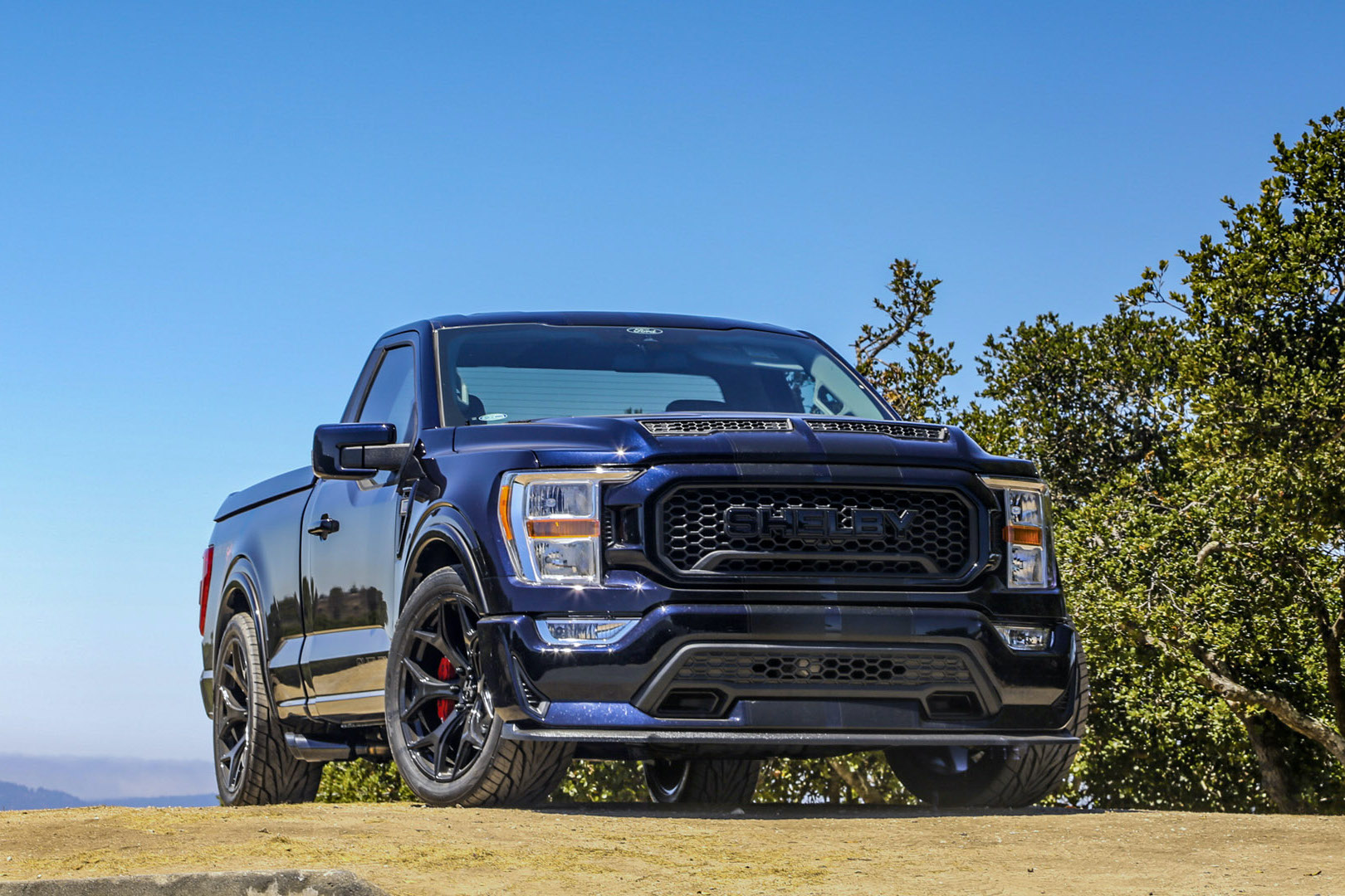 Shelby lowered the Sport on coilovers with adjustable Fox shocks, altered the upper control arms, and added a new rear sway bar. Traction bars keep the rear axle in place, and functional aero keeps it on the tarmac. A front splitter and side skirts reduce airflow under the truck, while a functional ram air hood and Shelby grille defend against overheating. Along with 22-inch wheels and generous Super Snake striping and badging, they make damn sure people know they’re looking at an authentic Shelby. And if any doubt remained, they’d only have to check the re-trimmed interior for the one feature universal to all Shelbys: The serial-numbered plaque.