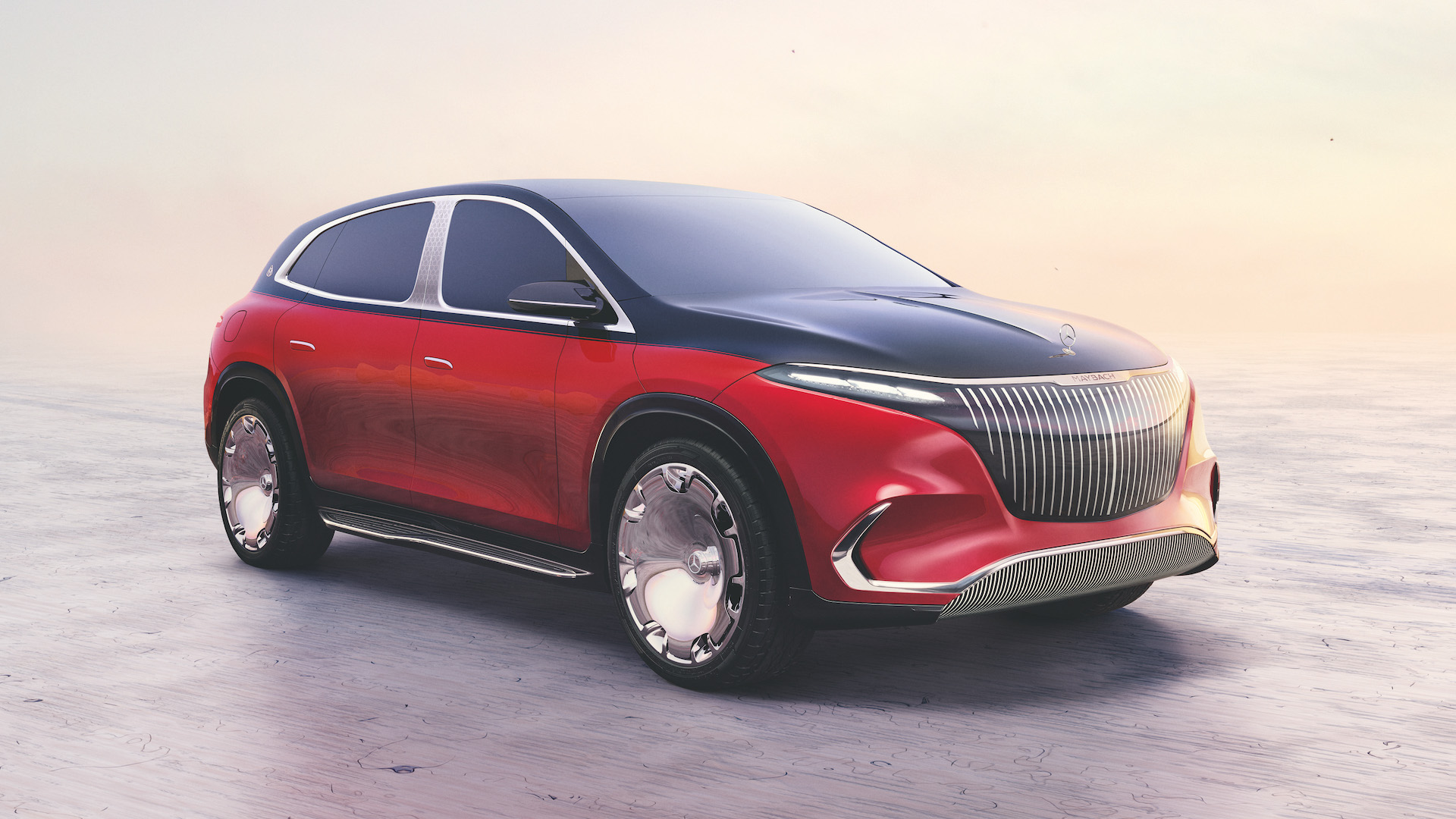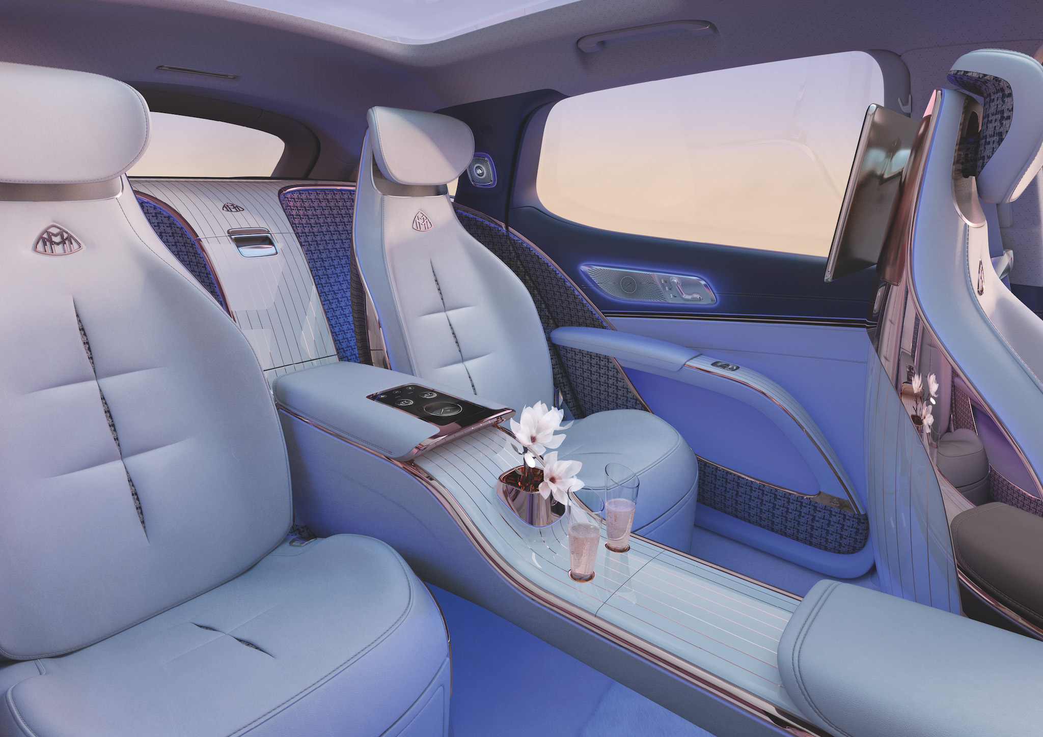Even though it’s electric, a lot of Maybach’s ultra-luxurious hallmarks remain. We’ve got an imposing pinstripe-style “grille” area, two-tone paint, some very chrome, very stylish wheels, and a cabin bathed in extreme elegance and luxury. I mean, the rear living quarters of existing Maybachs are already nice but this is quite a bit more modern. Just look at that bridge-style center console with dedicated vase and champagne flute holders. More Maybach-esque features include powered exterior door handles that present themselves to you as you approach, faux fur on the floor, and interior color schemes inspired by “fashion,” whatever that means.