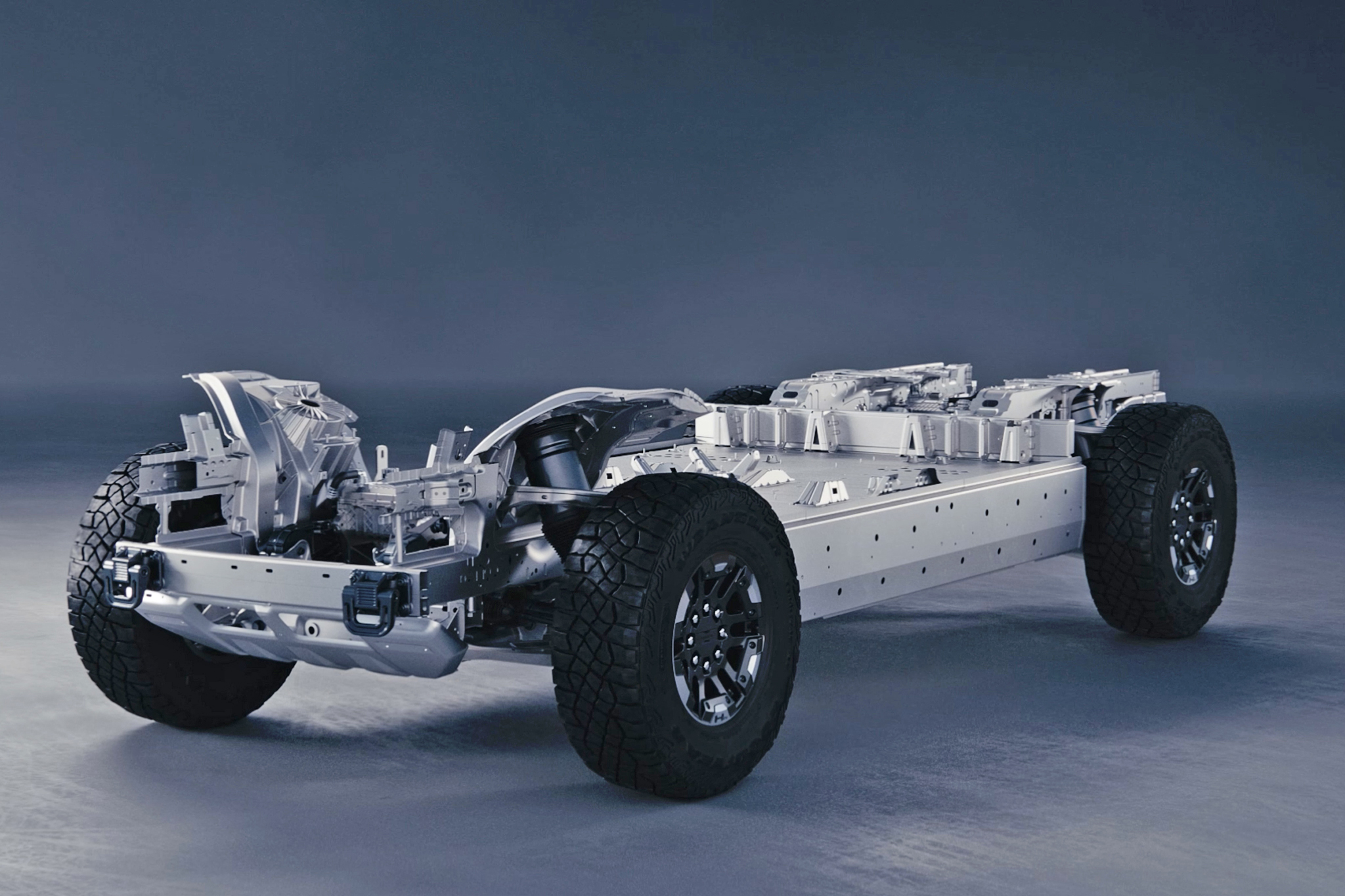 Each mode also gets a different adaptive damper calibration, and the dampers are said to be position sensitive so they can firm up more toward the ends of travel and be softer and more compliant in the middle. But the trucks I saw did not have representative hardware, so I can’t say whether or not they’ll have external reservoirs or even the basic beef of Raptor and TRX components. The dampers remain a big unknown, but it’s worth remembering that the Hummer EV’s independent rear suspension may require less elaborate dampers because there’s much less unsprung mass to control.