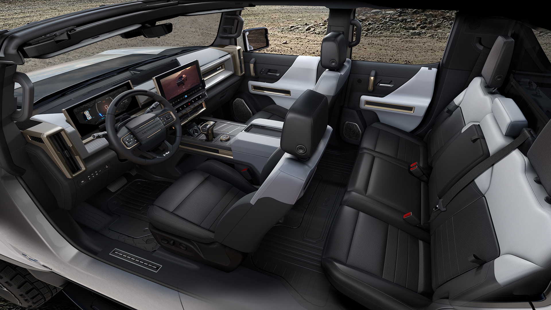 How does a crew cab Hummer EV pickup pull this off? For one, rear legroom isn’t up to the standards of the latest Ram and Ford crew cabs. Also, its bed is 5 feet long like a short-bed Tacoma, not 5-feet 7-inches long like a Raptor’s short bed. The Hummer’s bed does have two offsetting advantages: it is much broader than a Tacoma’s, and it comes with GMC’s Mutli-Pro tailgate. With the load-stop deployed, this tailgate can corral objects that are 6-feet 10-inches long—the same effective length as a GMC Sierra 1500 standard bed.