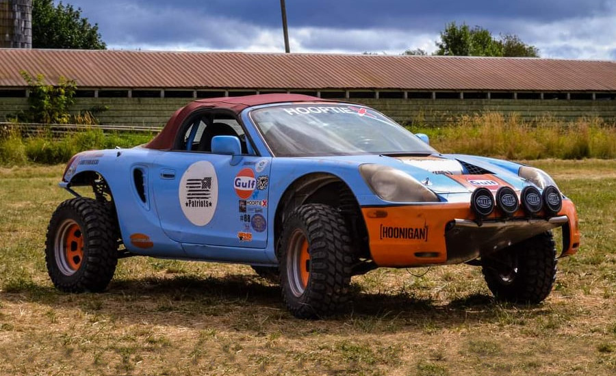 Meanwhile, the Gulf-liveried ZZW20 MR2 Spyder belongs to Kenny O’Brien, itself sporting a 1MZ swap from a Toyota Camry, good for around 200 horsepower. It also scored beefed up suspension at the rear with Silverado overload shocks to take the weight of the bigger motor. The car actually showed up at the Hoonigan facility earlier this year to tear around with a bunch of HooptieX competitors.