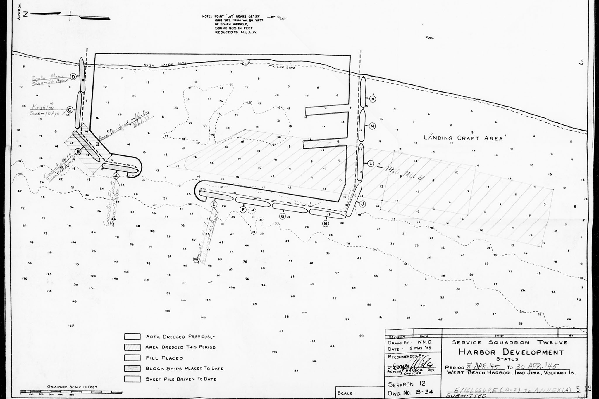 Likewise, it’s stated in this source from the National Archives that on June 13th, 1945, the final leg of the breakwater was completed when “Concrete Barge #30 [was] sunk in modified position Love… thus completing all three legs of the Iwo Jima Blockship Breakwater.”