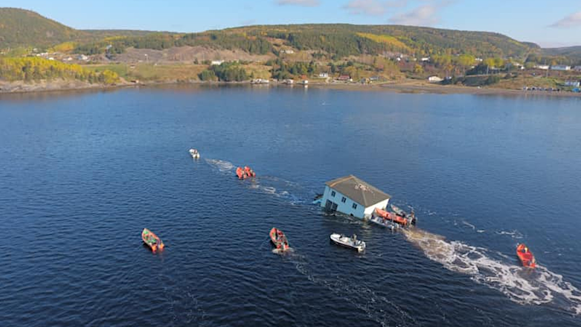 However, salvation was at hand. Lovell made it to shore and jumped in another dory, and was joined by community members who all pitched in to help. Before long there was a flurry of activity in the bay, as a fleet of tiny boats joined in to shift the beleaguered building. With the extra boats huffing and puffing to move the house, things quickly got going again. “When we got her moving, it was awesome,” said Lovell.