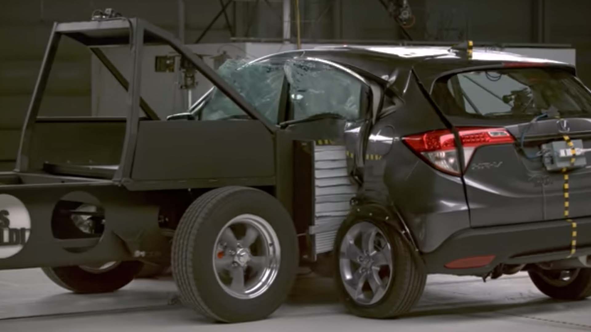 Finally, two modern crossovers were awarded poor ratings: the Mitsubishi Eclipse Cross and the Honda HR-V. The latter received only four good ratings in the 10 areas that were tested—we’re talking about driver and rear passenger categories like chest, neck, and head protection. Around the 1:40 mark in the video below, you can see that the HR-V’s B-pillar actually broke away at the bottom, allowing the crash sled to push halfway into the passenger compartment: