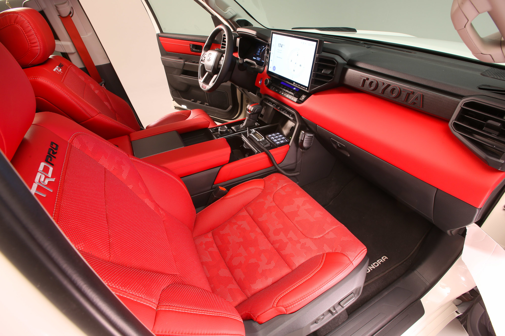 The build is based on the 2022 Tundra TRD Pro, packing the stock 3.5-liter twin-turbocharged V6 and hybrid system good for 437 horsepower and 583 lb-ft of torque. It’s paired with the standard ten-speed automatic transmission. The real changes are to the suspension, with TRD designing a special long-travel setup that still fits the Tundra’s standard mounting points. The upgrades should help the truck soak up big bumps more easily, and the anodized-red lower control arms also do a lot to improve the truck’s aesthetic, too.