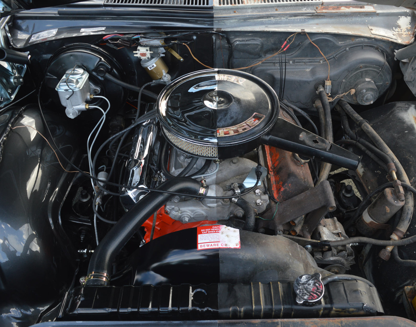Geoff didn’t phone in the project either, committing to the bit to the nth degree. The split continues throughout the whole car, even under the hood. One side of the engine bay is fresh, clean and tidy, the other tired and worn out. The line goes right down the middle of the air cleaner, and it’s fun to look at the pristine rocker cover on one side and the crusty part on the other. Even the radiator sticker is brand-new on the driver’s side, while faded and unreadable on the other.