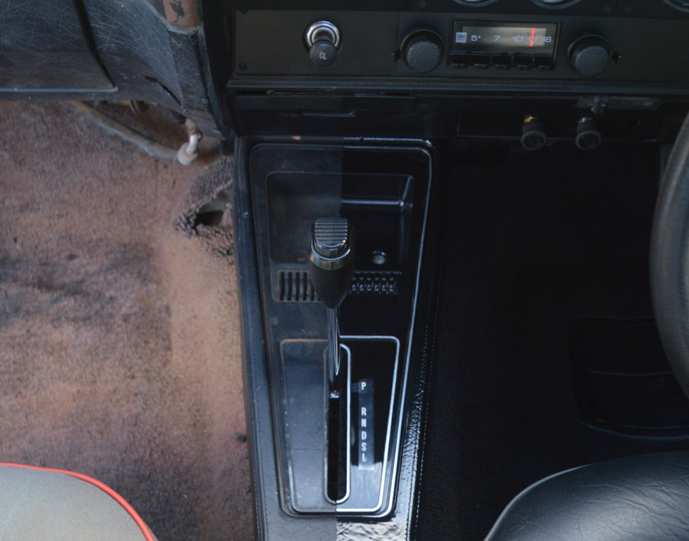 Those riding shotgun will quickly learn that the interior got much the same treatment. The driver gets a newly-upholstered leather seat and nice gauges, but that same dividing line runs right down the middle of the car. On the passenger side, filthy old carpet and a badly-worn dash show what the car was really like when the project started. It’s also amusing to note that the floor shifter and center console sits half-restored, half-not.