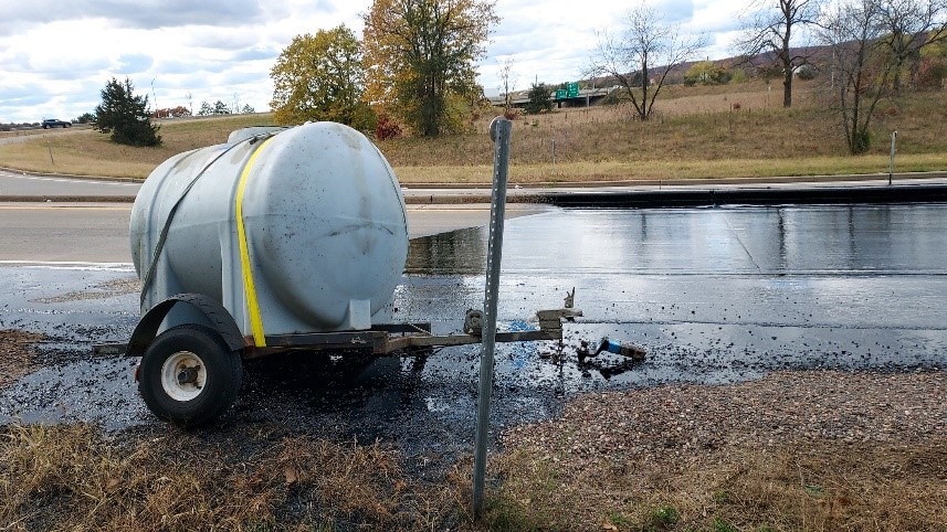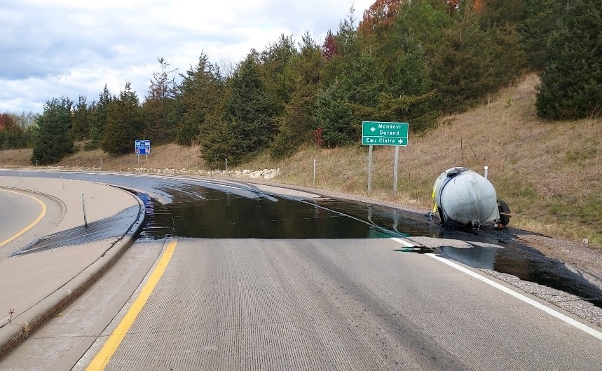 According to a post on Facebook from the Wisconsin State Patrol, a driver with a homemade trailer in tow was responsible for the mess. WSP says that the trailer reportedly blew a tire while exiting I-94, a four-lane highway where the trailer and its vehicle appeared to have been traveling westbound. The plastic drum strapped to the trailer promptly dumped its contents onto the asphalt—all 330 gallons.