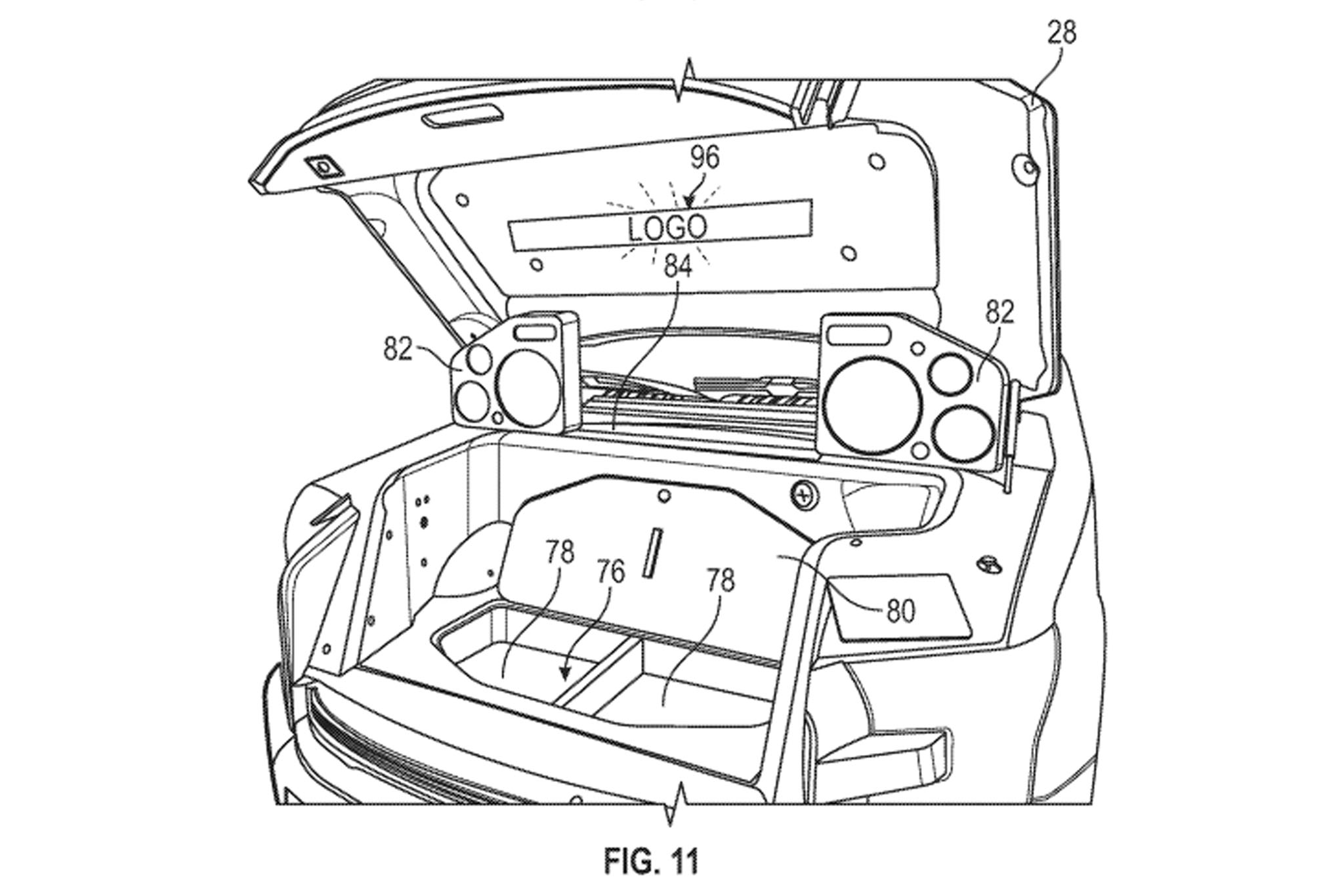 Indeed, 2,400 watts is plenty of power to do what Ford envisions here. In addition to the lights and illuminated logo the automaker seems to want on the concept, there are also two stowable speakers that are stored under the floor of the frunk. According to the patent, they could connect to the vehicle via Bluetooth and are controlled by a small panel located above the headlight. Also, mirroring the display that tells you what song is playing is a similarly-sized one over the opposite headlamp which displays the vehicle’s charge condition. It’s worth noting that both these panels are littered with USB ports, just to make sure everyone has a spot to charge their various devices.